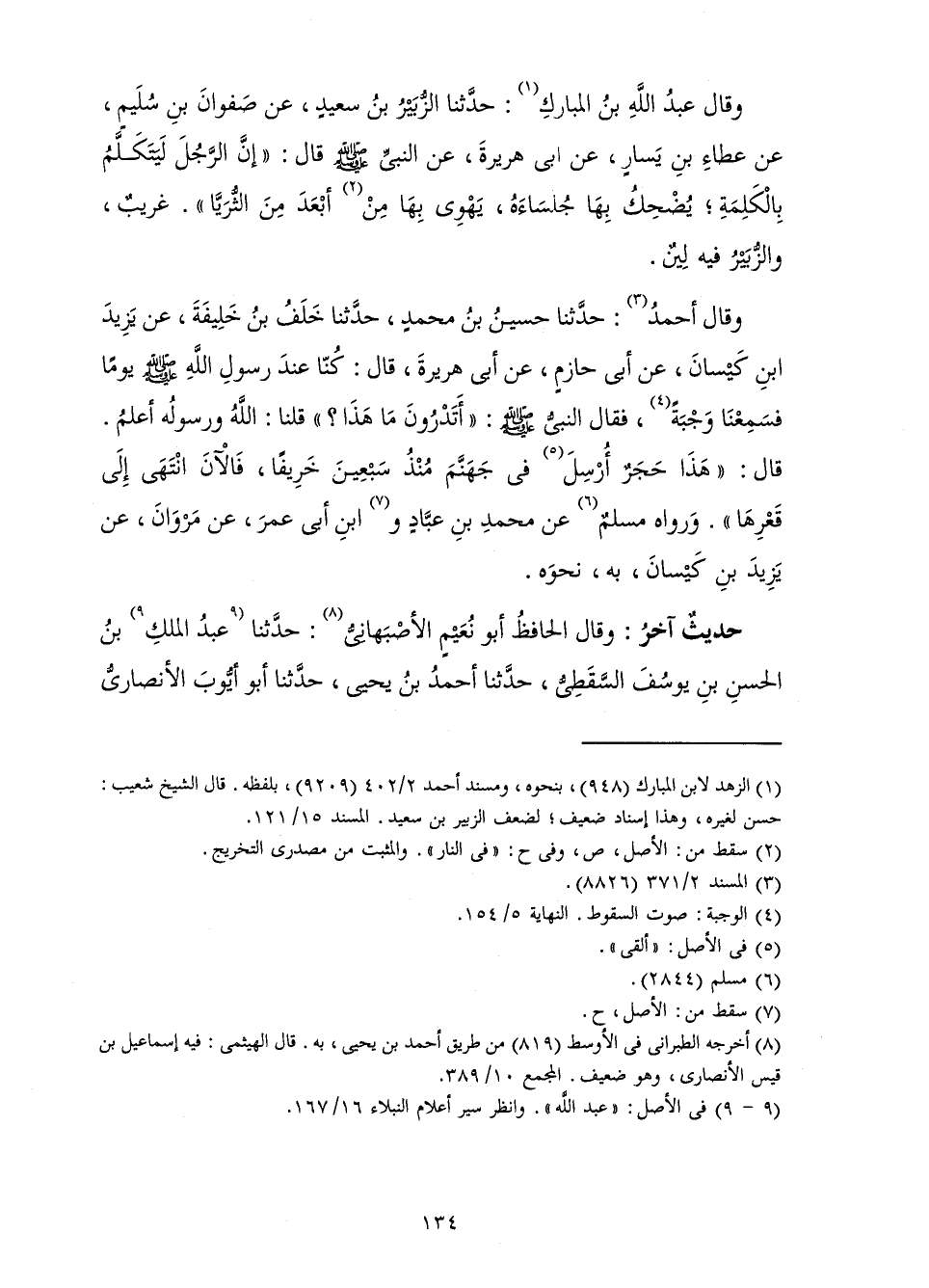 وَقَالَ أَحْمَدُ: حَدَّثَنَا حُسَيْنُ بْنُ مُحَمَّدٍ، حَدَّثَنَا خَلَفُ بْنُ خَلِيفَةَ، عَنْ يَزِيدَ بْنِ كَيْسَانَ، عَنْ أَبِي حَازِمٍ، عَنْ أَبِي هُرَيْرَةَ، قَالَ: «كُنَّا عِنْدَ رَسُولِ اللَّهِ صَلَّى اللَّهُ عَلَيْهِ وَسَلَّمَ يَوْمًا فَسَمِعْنَا وَجْبَةً، فَقَالَ النَّبِيُّ صَلَّى اللَّهُ عَلَيْهِ وَسَلَّمَ: " أَتَدْرُونَ مَا هَذَا؟ " قُلْنَا: اللَّهُ وَرَسُولُهُ أَعْلَمُ. قَالَ: " هَذَا حَجَرٌ أُرْسِلَ فِي جَهَنَّمَ مُنْذُ سَبْعِينَ خَرِيفًا، فَالْآنَ انْتَهَى إِلَى قَعْرِهَا» ". وَرَوَاهُ مُسْلِمٌ عَنْ مُحَمَّدِ بْنِ عَبَّادٍ وَابْنِ أَبِي عُمَرَ، عَنْ مَرْوَانَ، عَنْ يَزِيدَ بْنِ كَيْسَانَ، بِهِ، نَحْوَهُ.