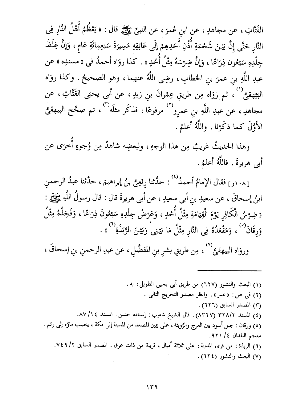 الْقَتَّاتِ، عَنْ مُجَاهِدٍ، عَنِ ابْنِ عُمَرَ، عَنِ النَّبِيِّ صَلَّى اللَّهُ عَلَيْهِ وَسَلَّمَ قَالَ: " «يَعْظُمُ أَهْلُ النَّارِ فِي النَّارِ حَتَّى إِنَّ بَيْنَ شَحْمَةِ أُذُنِ أَحَدِهِمْ إِلَى عَاتِقِهِ مَسِيرَةُ سَبْعِمِائَةِ عَامٍ، وَإِنَّ غِلَظَ جِلْدِهِ سَبْعُونَ ذِرَاعًا، وَإِنَّ ضِرْسَهُ مِثْلُ أُحُدٍ» ". كَذَا رَوَاهُ أَحْمَدُ فِي " مُسْنَدِهِ " عَنْ عَبْدِ اللَّهِ بْنِ عُمَرَ بْنِ الْخَطَّابِ، رَضِيَ اللَّهُ عَنْهُمَا، وَهُوَ الصَّحِيحُ. وَكَذَا رَوَاهُ الْبَيْهَقِيُّ، ثُمَّ رَوَاهُ مِنْ طَرِيقِ عِمْرَانَ بْنِ زَيْدٍ، عَنْ أَبِي يَحْيَى الْقَتَّاتِ، عَنْ مُجَاهِدٍ، عَنْ عَبْدِ اللَّهِ بْنِ عَمْرٍو مَرْفُوعًا، فَذَكَرَ مِثْلَهُ، ثُمَّ صَحَّحَ الْبَيْهَقِيُّ الْأَوَّلَ كَمَا ذَكَرْنَا. وَاللَّهُ أَعْلَمُ.