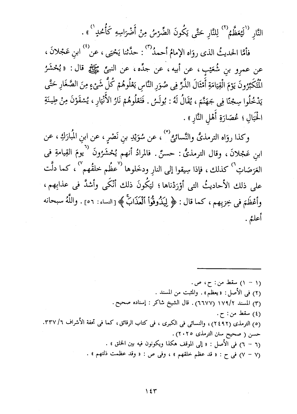 وَكَذَا رَوَاهُ التِّرْمِذِيُّ وَالنَّسَائِيُّ "، عَنْ سُوَيْدِ بْنِ نَصْرٍ، عَنِ ابْنِ الْمُبَارَكِ، عَنِ ابْنِ عَجْلَانَ، وَقَالَ التِّرْمِذِيُّ: حَسَنٌ. فَالْمُرَادُ أَنَّهُمْ يُحْشَرُونَ يَوْمَ الْقِيَامَةِ فِي الْعَرَصَاتِ كَذَلِكَ، فَإِذَا سِيقُوا إِلَى النَّارِ وَدَخَلُوهَا عَظُمَ خَلْقُهُمْ، كَمَا دَلَّتْ عَلَى ذَلِكَ الْأَحَادِيثُ الَّتِي أَوْرَدْنَاهَا ; لِيَكُونَ ذَلِكَ أَنَكَى وَأَشَدَّ فِي عَذَابِهِمْ، وَأَعْظَمَ فِي خِزْيِهِمْ، كَمَا قَالَ: {لِيَذُوقُوا الْعَذَابَ} [النساء: 56] . وَاللَّهُ سُبْحَانَهُ أَعْلَمُ.
