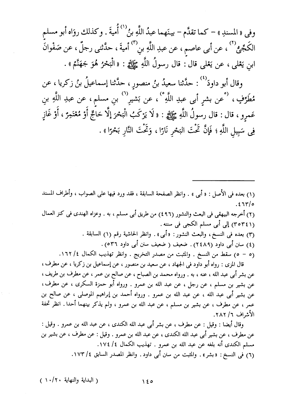 وَفَى " الْمُسْنَدِ " - كَمَا تَقَدَّمَ - بَيْنَهُمَا عَبْدُ اللَّهِ بْنُ أُمَيَّةَ. وَكَذَلِكَ رَوَاهُ أَبُو مُسْلِمٍ الْكَجِّيُّ، عَنْ أَبِي عَاصِمٍ، عَنْ عَبْدِ اللَّهِ بْنِ أُمَيَّةَ، حَدَّثَنِي رَجُلٌ، عَنْ صَفْوَانَ بْنِ يَعْلَى، عَنْ يَعْلَى قَالَ: قَالَ رَسُولُ اللَّهِ صَلَّى اللَّهُ عَلَيْهِ وَسَلَّمَ: " «الْبَحْرُ هُوَ جَهَنَّمُ» ".