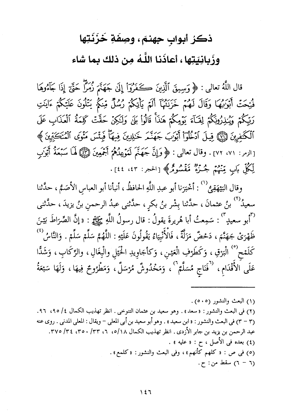 وَقَالَ الْبَيْهَقِيُّ: أَخْبَرَنَا أَبُو عَبْدِ اللَّهِ الْحَافِظُ، أَنْبَأَنَا أَبُو الْعَبَّاسِ الْأَصَمُّ، حَدَّثَنَا سَعِيدُ بْنُ عُثْمَانَ، حَدَّثَنَا بِشْرُ بْنُ بَكْرٍ، حَدَّثَنِي عَبْدُ الرَّحْمَنِ بْنُ يَزِيدَ، حَدَّثَنِي أَبُو سَعِيدٍ: سَمِعْتُ أَبَا هُرَيْرَةَ يَقُولُ: قَالَ رَسُولُ اللَّهِ صَلَّى اللَّهُ عَلَيْهِ وَسَلَّمَ: " «إِنَّ الصِّرَاطَ بَيْنَ ظَهْرَيْ جَهَنَّمَ، دَحْضٌ مَزَلَّةٌ، فَالْأَنْبِيَاءُ يَقُولُونَ عَلَيْهِ: اللَّهُمَّ سَلِّمْ سَلِّمْ. وَالنَّاسُ كَلَمْحِ الْبَرْقِ، وَكَطَرْفِ الْعَيْنِ، وَكَأَجَاوِيدِ الْخَيْلِ وَالْبِغَالِ، وَالرِّكَابِ، وَشَدًّا عَلَى الْأَقْدَامِ، فَنَاجٍ مُسَلَّمٌ، وَمَخْدُوشٌ مُرْسَلٌ، وَمَطْرُوحٌ فِيهَا، وَلَهَا سَبْعَةُ