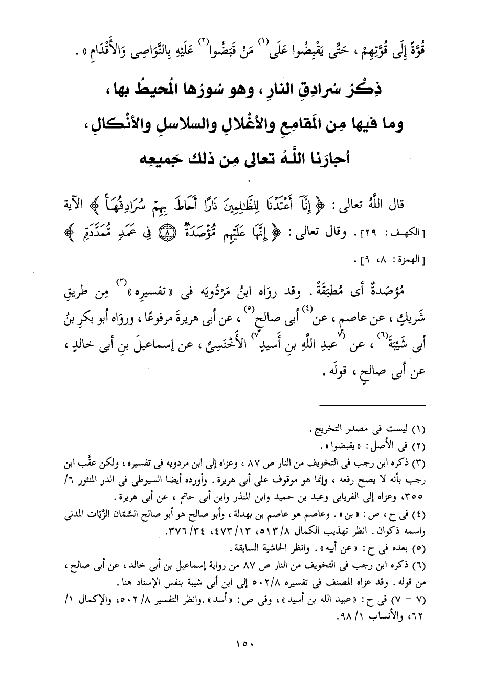 قَالَ اللَّهُ تَعَالَى: {إِنَّا أَعْتَدْنَا لِلظَّالِمِينَ نَارًا أَحَاطَ بِهِمْ سُرَادِقُهَا} [الكهف: 29] الْآيَةَ [الْكَهْفِ: 29] . وَقَالَ تَعَالَى {إِنَّهَا عَلَيْهِمْ مُؤْصَدَةٌ فِي عَمَدٍ مُمَدَّدَةٍ} [الهمزة: 8]