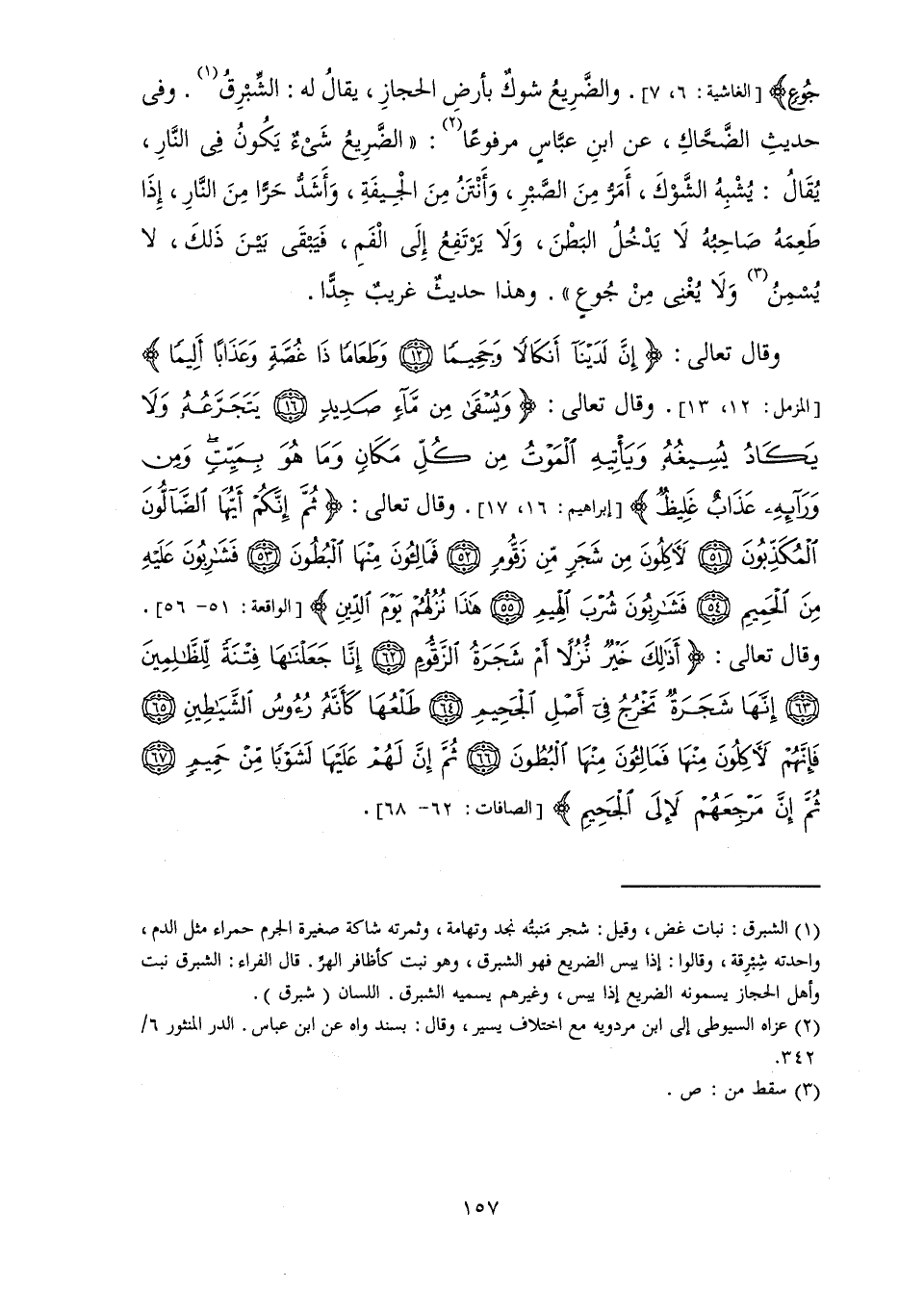 [الْغَاشِيَةِ: 6، 7] . وَالضَّرِيعُ شَوْكٌ بِأَرْضِ الْحِجَازِ، يُقَالُ لَهُ: الشِّبْرِقُ وَفِي حَدِيثِ الضَّحَّاكِ، عَنِ ابْنِ عَبَّاسٍ مَرْفُوعًا: " «الضَّرِيعُ شَيْءٌ يَكُونُ فِي النَّارِ، يُقَالُ: يُشْبِهُ الشَّوْكَ، أَمَرُّ مِنَ الصَّبْرِ، وَأَنْتَنُ مِنَ الْجِيفَةِ، وَأَشَدُّ حَرًّا مِنَ النَّارِ، إِذَا طَعِمَهُ صَاحِبُهُ لَا يَدْخُلُ الْبَطْنَ، وَلَا يَرْتَفِعُ إِلَى الْفَمِ، فَيَبْقَى بَيْنَ ذَلِكَ، لَا يُسْمِنُ وَلَا يُغْنِي مِنْ جُوعٍ» ". وَهَذَا حَدِيثٌ غَرِيبٌ جِدًّا.