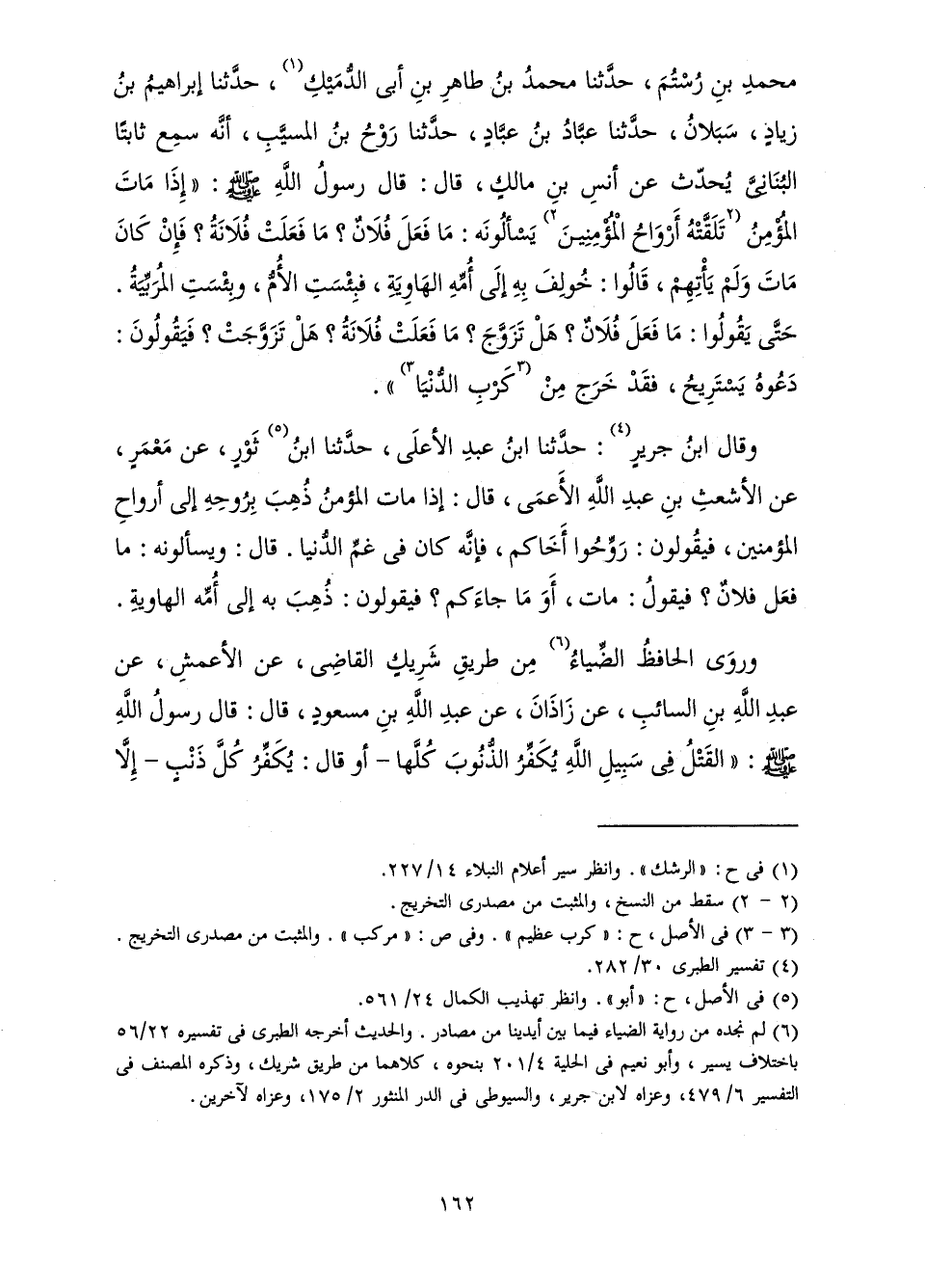 وَقَالَ ابْنُ جَرِيرٍ: حَدَّثَنَا ابْنُ عَبْدِ الْأَعْلَى، حَدَّثَنَا ابْنُ ثَوْرٍ، عَنْ مَعْمَرٍ، عَنِ الْأَشْعَثِ بْنِ عَبْدِ اللَّهِ الْأَعْمَى، قَالَ: إِذَا مَاتَ الْمُؤْمِنُ ذُهِبَ بِرُوحِهِ إِلَى أَرْوَاحِ الْمُؤْمِنِينَ، فَيَقُولُونَ؟ رَوِّحُوا أَخَاكُمْ، فَإِنَّهُ كَانَ فِي غَمِّ الدُّنْيَا. قَالَ: وَيَسْأَلُونَهُ: مَا فَعَلَ فُلَانٌ؟ فَيَقُولُ: مَاتَ، أَوَمَا جَاءَكُمْ؟ فَيَقُولُونَ: ذُهِبَ بِهِ إِلَى أُمِّهِ الْهَاوِيَةِ. وَرَوَى الْحَافِظُ الضِّيَاءُ مِنْ طَرِيقِ شَرِيكٍ الْقَاضِي، عَنِ الْأَعْمَشِ، عَنْ عَبْدِ اللَّهِ بْنِ السَّائِبِ، عَنْ زَاذَانَ، عَنْ عَبْدِ اللَّهِ بْنِ مَسْعُودٍ، قَالَ: قَالَ رَسُولُ اللَّهِ صَلَّى اللَّهُ عَلَيْهِ وَسَلَّمَ: " «الْقَتْلُ فِي سَبِيلِ اللَّهِ يُكَفِّرُ الذُّنُوبَ كُلَّهَا - أَوْ قَالَ: يُكَفِّرُ كُلَّ ذَنْبٍ - إِلَّا
