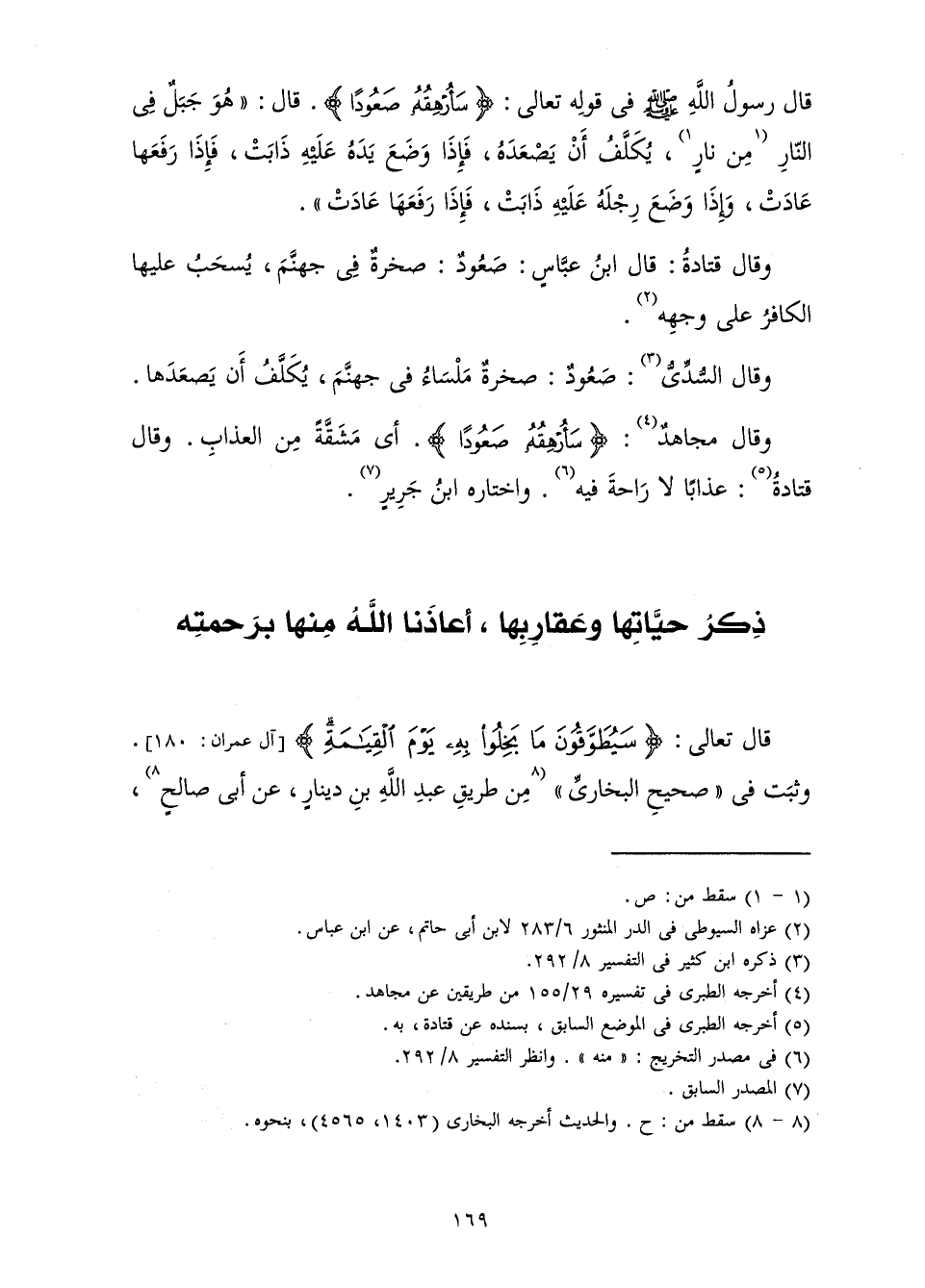 «قَالَ رَسُولُ اللَّهِ صَلَّى اللَّهُ عَلَيْهِ وَسَلَّمَ فِي قَوْلِهِ تَعَالَى: {سَأُرْهِقُهُ صَعُودًا} [المدثر: 17] . قَالَ: " هُوَ جَبَلٌ فِي النَّارِ مِنْ نَارٍ، يُكَلَّفُ أَنْ يَصْعَدَهُ، فَإِذَا وَضَعَ يَدَهُ عَلَيْهِ ذَابَتْ، فَإِذَا رَفَعَهَا عَادَتْ، وَإِذَا وَضَعَ رِجْلَهُ عَلَيْهِ ذَابَتْ، فَإِذَا رَفَعَهَا عَادَتْ» ".