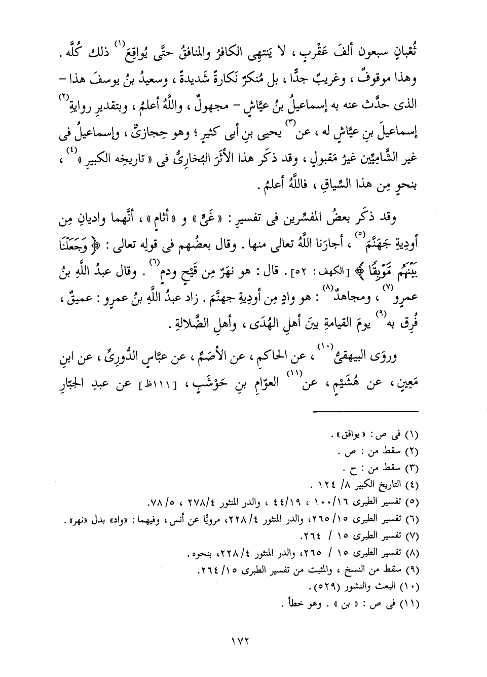 ثُعْبَانٍ سَبْعُونَ أَلْفَ عَقْرَبٍ، لَا يَنْتَهِي الْكَافِرُ وَالْمُنَافِقُ حَتَّى يُوَاقِعَ ذَلِكَ كُلَّهُ، وَهَذَا مَوْقُوفٌ، وَغَرِيبٌ جِدًّا، بَلْ مُنْكَرٌ نَكَارَةً شَدِيدَةً، وَسَعِيدُ بْنُ يُوسُفَ هَذَا - الَّذِي حَدَّثَ عَنْهُ بِهِ إِسْمَاعِيلُ بْنُ عَيَّاشٍ - مَجْهُولٌ، وَاللَّهُ أَعْلَمُ، وَبِتَقْدِيرِ رِوَايَةِ إِسْمَاعِيلَ بْنِ عَيَّاشٍ لَهُ، عَنْ يَحْيَى بْنِ أَبِي كَثِيرٍ ; وَهُوَ حِجَازِيٌّ، وَإِسْمَاعِيلُ فِي غَيْرِ الشَّامِيِّينَ غَيْرُ مَقْبُولٍ، وَقَدْ ذَكَرَ هَذَا الْأَثَرَ الْبُخَارِيُّ فِي " تَارِيخِهِ الْكَبِيرِ "، بِنَحْوٍ مِنْ هَذَا السِّيَاقِ، فَاللَّهُ أَعْلَمُ.