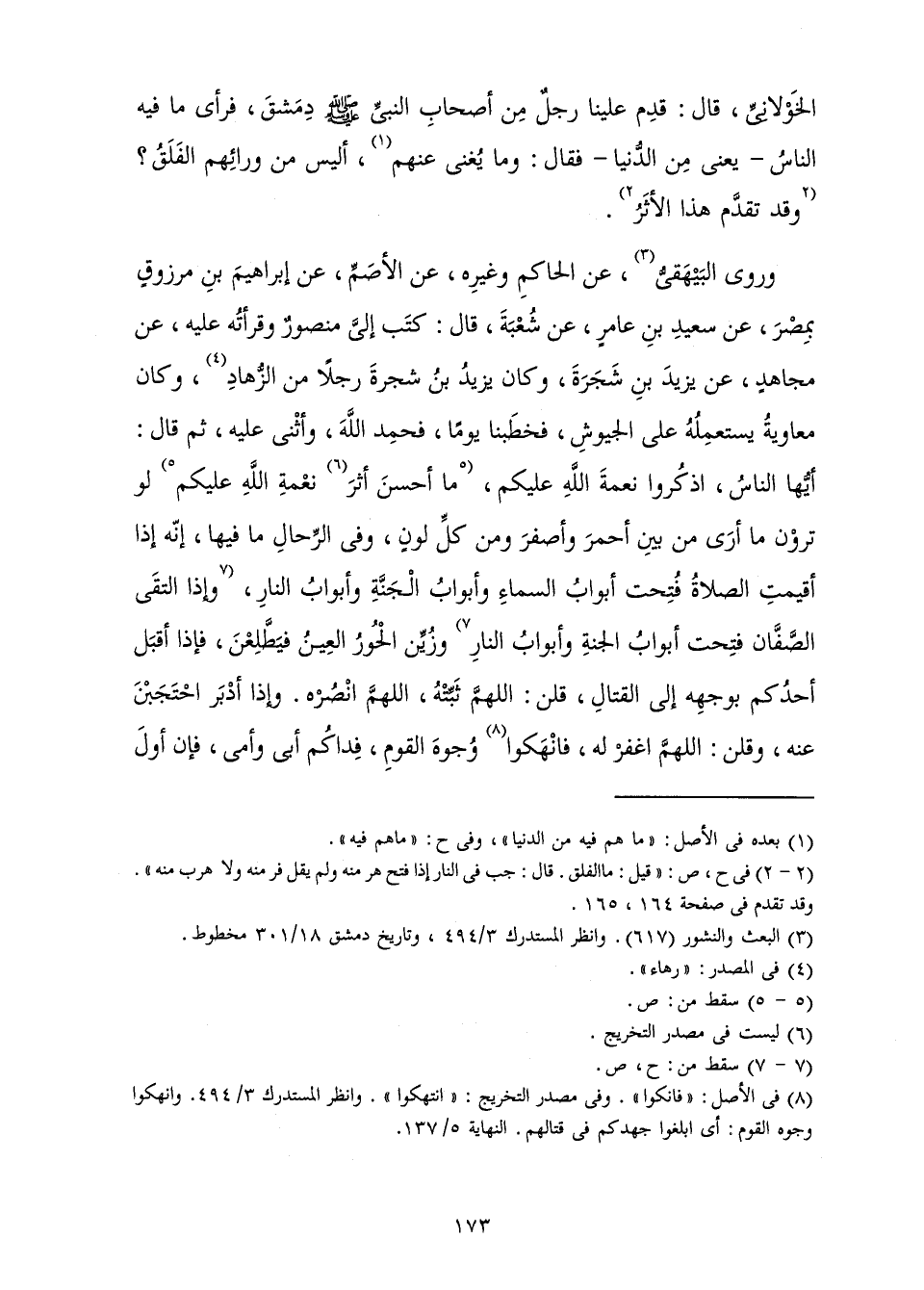 الْخَوْلَانِيِّ، قَالَ: قَدِمِ عَلَيْنَا رَجُلٌ مِنْ أَصْحَابِ النَّبِيِّ صَلَّى اللَّهُ عَلَيْهِ وَسَلَّمَ دِمَشْقَ، فَرَأَى مَا فِيهِ النَّاسُ - يَعْنِي مِنَ الدُّنْيَا - فَقَالَ: وَمَا يُغْنِي عَنْهُمْ، أَلَيْسَ مِنْ وَرَائِهِمُ الْفَلَقُ؟ وَقَدْ تَقَدَّمَ هَذَا الْأَثَرُ.