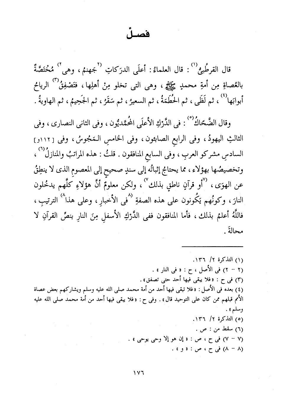 وَقَالَ الضَّحَّاكُ: فِي الدَّرْكِ الْأَعْلَى الْمُحَمَّدِيُّونَ، وَفِي الثَّانِي النَّصَارَى، وَفِي الثَّالِثِ الْيَهُودُ، وَفِي الرَّابِعِ الصَّابِئُونَ، وَفِي الْخَامِسِ الْمَجُوسُ، وَفِي السَّادِسِ مُشْرِكُو الْعَرَبِ، وَفِي السَّابِعِ الْمُنَافِقُونَ. قُلْتُ: هَذِهِ الْمَرَاتِبُ وَالْمَنَازِلُ، وَتَخْصِيصُهَا بِهَؤُلَاءِ، مِمَّا يَحْتَاجُ إِثْبَاتُهُ إِلَى سَنَدٍ صَحِيحٍ إِلَى الْمَعْصُومِ الَّذِي لَا يَنْطِقُ عَنِ الْهَوَى، أَوْ قُرْآنٍ نَاطِقٍ بِذَلِكَ، وَلَكِنْ مَعْلُومٌ أَنَّ هَؤُلَاءِ كُلَّهُمْ يَدْخُلُونَ النَّارَ، وَكَوْنُهُمْ يَكُونُونَ عَلَى هَذِهِ الصِّفَةِ فِي الْأَخْبَارِ، وَعَلَى هَذَا التَّرْتِيبِ، فَاللَّهُ أَعْلَمُ بِذَلِكَ، فَأَمَّا الْمُنَافِقُونَ فَفِي الدَّرْكِ الْأَسْفَلِ مِنَ النَّارِ بِنَصِّ الْقُرْآنِ لَا مَحَالَةَ.