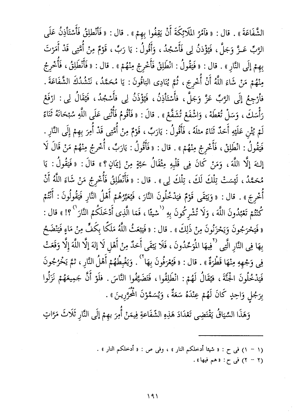 الشَّفَاعَةَ ". قَالَ: " فَآمُرُ الْمَلَائِكَةَ أَنْ يَقِفُوا بِهِمْ ". قَالَ: " فَأَنْطَلِقُ فَأَسْتَأْذِنُ عَلَى الرَّبِّ عَزَّ وَجَلَّ، فَيُؤْذَنُ لِي فَأَسْجُدُ، وَأَقُولُ: يَا رَبِّ، قَوْمٌ مِنْ أُمَّتِي قَدْ أَمَرْتَ بِهِمْ إِلَى النَّارِ ". قَالَ: " فَيَقُولُ: انْطَلِقْ فَأَخْرِجْ مِنْهُمْ ". قَالَ: " فَأَنْطَلِقُ، فَأُخْرِجُ مِنْهُمْ مَنْ شَاءَ اللَّهُ أَنْ أُخْرِجَ، ثُمَّ يُنَادِي الْبَاقُونَ: يَا مُحَمَّدُ، نَنْشُدُكَ الشَّفَاعَةَ. فَأَرْجِعُ إِلَى الرَّبِّ عَزَّ وَجَلَّ، فَأَسْتَأْذِنُ، فَيُؤْذَنُ لِي فَأَسْجُدُ، فَيُقَالُ لِي: ارْفَعْ رَأْسَكَ، وَسُلْ تُعْطَهْ، وَاشْفَعْ تُشَفَّعْ ". قَالَ: " فَأَقُومُ فَأُثْنِي عَلَى اللَّهِ سُبْحَانَهُ ثَنَاءً لَمْ يُثْنِ عَلَيْهِ أَحَدٌ ثَنَاءً مِثْلَهُ، فَأَقُولُ: يَا رَبِّ، قَوْمٌ مِنْ أُمَّتِي قَدْ أُمِرَ بِهِمْ إِلَى النَّارِ. فَيَقُولُ: انْطَلِقْ، فَأَخْرِجْ مِنْهُمْ ". قَالَ: " فَأَقُولُ: يَا رَبِّ، أُخْرِجُ مِنْهُمْ مَنْ قَالَ لَا إِلَهَ إِلَّا اللَّهُ، وَمَنْ كَانَ فِي قَلْبِهِ مِثْقَالُ حَبَّةٍ مِنْ إِيمَانٍ؟ " قَالَ: " فَيَقُولُ: يَا مُحَمَّدُ، لَيْسَتْ تِلْكَ لَكَ، تِلْكَ لِي ". قَالَ: " فَأَنْطَلِقُ فَأُخْرِجُ مَنْ شَاءَ اللَّهُ أَنْ أُخْرِجَ ". قَالَ: " وَيَبْقَى قَوْمٌ فَيَدْخُلُونَ النَّارَ، فَيُعَيِّرُهُمْ أَهْلُ النَّارِ فَيَقُولُونَ: أَنْتُمْ كُنْتُمْ تَعْبُدُونَ اللَّهَ، وَلَا تُشْرِكُونَ بِهِ شَيْئًا، فَمَا الَّذِي أَدْخَلَكُمُ النَّارَ؟! " قَالَ: " فَيَحْرَجُونَ وَيَحْزَنُونَ مِنْ ذَلِكَ ". قَالَ: " فَيَبْعَثُ اللَّهُ مَلِكًا بِكَفٍّ مِنْ مَاءٍ فَيَنْضَحُ بِهَا فِي النَّارِ الَّتِي فِيهَا الْمُوَحِّدُونَ، فَلَا يَبْقَى أَحَدٌ مِنْ أَهْلِ لَا إِلَهَ إِلَّا اللَّهُ إِلَّا وَقَعَتْ فِي وَجْهِهِ مِنْهَا قَطْرَةٌ ". قَالَ: " فَيُعْرَفُونَ بِهَا. وَيَغْبِطُهُمْ أَهْلُ النَّارِ، ثُمَّ يَخْرُجُونَ فَيَدْخُلُونَ الْجَنَّةَ، فَيُقَالُ لَهُمْ: انْطَلِقُوا، فَتَضَيَّفُوا النَّاسَ. فَلَوْ أَنَّ جَمِيعَهُمْ نَزَلُوا بِرَجُلٍ وَاحِدٍ كَانَ لَهُمْ عِنْدَهُ سَعَةٌ، وَيُسَمَّوْنَ الْمُحَرِّرِينَ» ".