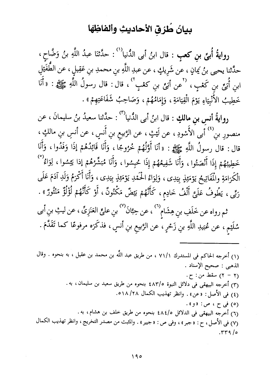 رِوَايَةُ أُبَيِّ بْنِ كَعْبٍ: قَالَ ابْنُ أَبِي الدُّنْيَا: حَدَّثَنَا عَبْدُ اللَّهِ بْنُ وَضَّاحٍ، حَدَّثَنَا يَحْيَى بْنُ يَمَانٍ، عَنْ شَرِيكٍ، عَنْ عَبْدِ اللَّهِ بْنِ مُحَمَّدِ بْنِ عَقِيلٍ، عَنِ الطُّفَيْلِ بْنِ أُبَيِّ بْنِ كَعْبٍ، عَنْ أُبَيِّ بْنِ كَعْبٍ، قَالَ: قَالَ رَسُولُ اللَّهِ صَلَّى اللَّهُ عَلَيْهِ وَسَلَّمَ: " «أَنَا خَطِيبُ الْأَنْبِيَاءِ يَوْمَ الْقِيَامَةِ، وَإِمَامُهُمْ، وَصَاحِبُ شَفَاعَتِهِمْ» ".
