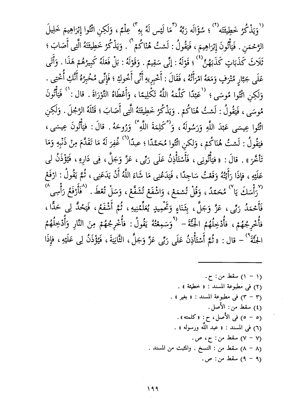 وَيَذْكُرُ خَطِيئَتَهُ ; سُؤَالَهُ رَبَّهُ مَا لَيْسَ لَهُ بِهِ عِلْمٌ، وَلَكِنِ ائْتُوا إِبْرَاهِيمَ خَلِيلَ الرَّحْمَنِ. فَيَأْتُونَ إِبْرَاهِيمَ، فَيَقُولُ: لَسْتُ هُنَاكُمْ. وَيَذْكُرُ خَطِيئَتَهُ الَّتِي أَصَابَ، ثَلَاثَ كَذَبَاتٍ كَذَبَهُنَّ ; قَوْلَهُ: إِنِّي سَقِيمٌ. وَقَوْلَهُ: بَلْ فَعَلَهُ كَبِيرُهُمْ هَذَا. وَأَتَى عَلَى جَبَّارٍ مُتْرَفٍ وَمَعَهُ امْرَأَتُهُ، فَقَالَ: أَخْبِرِيهِ أَنِّي أَخُوكِ ; فَإِنِّي مُخْبِرُهُ أَنَّكِ أُخْتِي. وَلَكِنِ ائْتُوا مُوسَى ; عَبْدًا كَلَّمَهُ اللَّهُ تَكْلِيمًا، وَأَعْطَاهُ التَّوْرَاةَ. قَالَ: فَيَأْتُونَ مُوسَى، فَيَقُولُ: لَسْتُ هُنَاكُمْ. وَيَذْكُرُ خَطِيئَتَهُ الَّتِي أَصَابَ ; قَتَلَهُ الرَّجُلَ. وَلَكِنِ ائْتُوا عِيسَى عَبْدَ اللَّهِ وَرَسُولُهُ، وَكَلِمَةَ اللَّهِ وَرُوحَهُ. قَالَ: فَيَأْتُونَ عِيسَى، فَيَقُولُ: لَسْتُ هُنَاكُمْ، وَلَكِنِ ائْتُوا مُحَمَّدًا، عَبْدًا غُفِرَ لَهُ مَا تَقَدَّمَ مِنْ ذَنْبِهِ وَمَا تَأَخَّرَ ". قَالَ: " فَيَأْتُونِي، فَأَسْتَأْذِنُ عَلَى رَبِّي، عَزَّ وَجَلَّ، فِي دَارِهِ، فَيُؤْذَنُ لِي عَلَيْهِ، فَإِذَا رَأَيْتُهُ وَقَعْتُ سَاجِدًا، فَيَدَعُنِي مَا شَاءَ اللَّهُ أَنْ يَدَعَنِي، ثُمَّ يَقُولُ: ارْفَعْ رَأْسَكَ يَا مُحَمَّدُ، وَقُلْ تُسْمَعْ، وَاشْفَعْ تُشَفَّعْ، وَسَلْ تُعْطَ. فَأَرْفَعُ رَأْسِي فَأَحْمَدُ رَبِّي، عَزَّ وَجَلَّ، بِثَنَاءٍ وَتَحْمِيدٍ يُعَلِّمُنِيهِ، ثُمَّ أَشْفَعُ، فَيَحِدُّ لِي حَدًّا، فَأُخْرِجُهُمْ، فَأُدْخِلُهُمُ الْجَنَّةَ - وَسَمِعَتُهُ يَقُولُ: فَأُخْرِجُهُمْ مِنَ النَّارِ وَأُدْخِلُهُمُ الْجَنَّةَ - قَالَ: " ثُمَّ أَسْتَأْذِنُ عَلَى رَبِّي عَزَّ وَجَلَّ، الثَّانِيَةَ، فَيُؤْذَنُ لِي عَلَيْهِ، فَإِذَا
