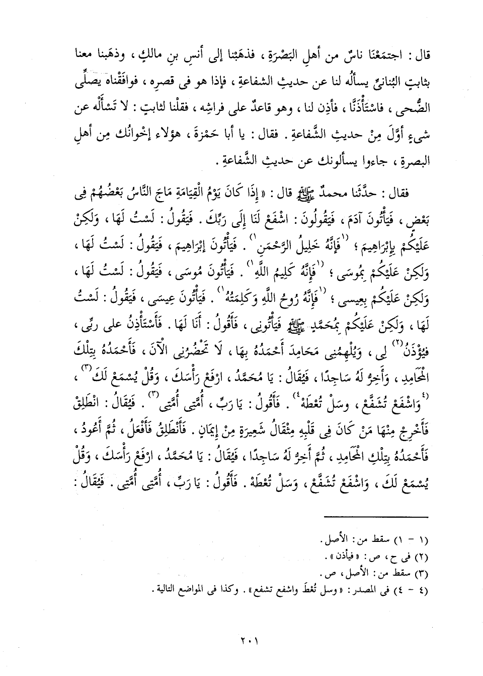 قَالَ: اجْتَمَعْنَا نَاسٌ مِنْ أَهْلِ الْبَصْرَةِ، فَذَهَبْنَا إِلَى أَنَسِ بْنِ مَالِكٍ، وَذَهَبْنَا مَعَنَا بِثَابِتٍ الْبُنَانِيِّ يَسْأَلُهُ لَنَا عَنْ حَدِيثِ الشَّفَاعَةِ، فَإِذَا هُوَ فِي قَصْرِهِ، فَوَافَقْنَاهُ يُصَلِّي الضُّحَى -، فَاسْتَأْذَنَّا، فَأَذِنَ لَنَا، وَهُوَ قَاعِدٌ عَلَى فِرَاشِهِ، فَقُلْنَا لِثَابِتٍ: لَا تَسْأَلْهُ عَنْ شَيْءٍ أَوَّلَ مِنْ حَدِيثِ الشَّفَاعَةِ. فَقَالَ: يَا أَبَا حَمْزَةَ، هَؤُلَاءِ إِخْوَانُكَ مِنْ أَهْلِ الْبَصْرَةِ، جَاءُوا يَسْأَلُونَكَ عَنْ حَدِيثِ الشَّفَاعَةِ.