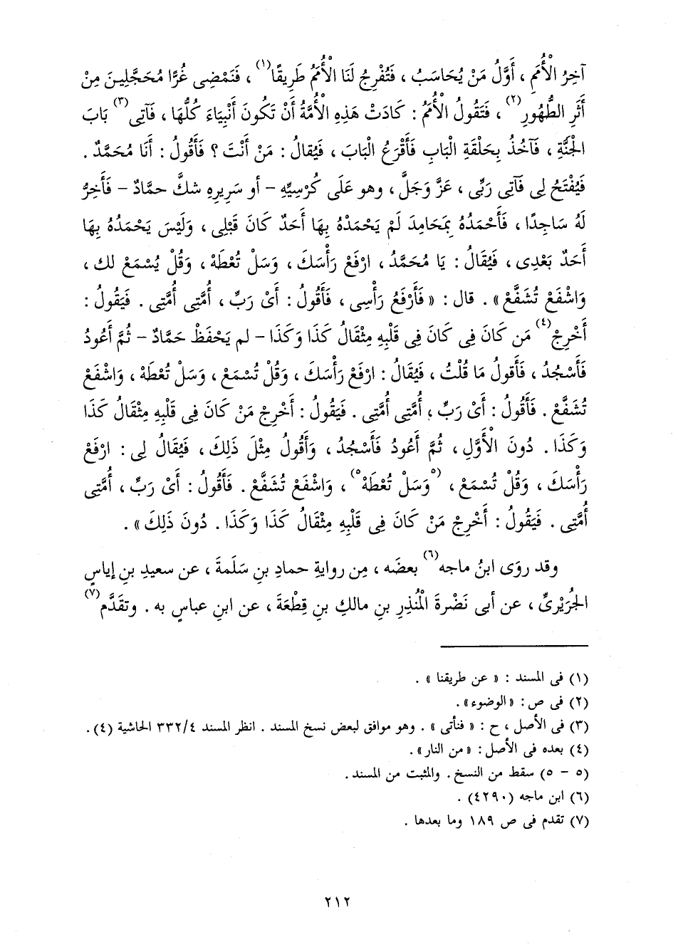 آخِرُ الْأُمَمِ، أَوَّلُ مَنْ يُحَاسَبُ، فَتُفْرِجُ لَنَا الْأُمَمُ طَرِيقًا، فَنَمْضِي غُرًّا مُحَجَّلِينَ مِنْ أَثَرِ الطُّهُورِ، فَتَقُولُ الْأُمَمُ: كَادَتْ هَذِهِ الْأُمَّةُ أَنْ تَكُونَ أَنْبِيَاءَ كُلُّهَا، فَآتِي بَابَ الْجَنَّةِ، فَآخُذُ بِحَلْقَةِ الْبَابِ فَأَقْرَعُ الْبَابَ، فَيُقَالُ: مَنْ أَنْتَ؟ فَأَقُولُ: أَنَا مُحَمَّدٌ. فَيُفْتَحُ لِي فَآتِي رَبِّي، عَزَّ وَجَلَّ، وَهُوَ عَلَى كُرْسِيِّهِ - أَوْ سَرِيرِهِ شَكَّ حَمَّادٌ - فَأَخِرُّ لَهُ سَاجِدًا، فَأَحْمَدُهُ بِمَحَامِدَ لَمْ يَحْمَدْهُ بِهَا أَحَدٌ كَانَ قَبْلِي، وَلَيْسَ يَحْمَدُهُ بِهَا أَحَدٌ بَعْدِي، فَيُقَالُ: يَا مُحَمَّدُ، ارْفَعْ رَأْسَكَ، وَسَلْ تُعْطَهْ، وَقُلْ يُسْمَعْ لَكَ، وَاشْفَعْ تُشَفَّعْ ". قَالَ: " فَأَرْفَعُ رَأْسِي، فَأَقُولُ: أَيْ رَبِّ، أُمَّتِي أُمَّتِي. فَيَقُولُ: أَخْرِجْ مَنْ كَانَ فِي قَلْبِهِ مِثْقَالُ كَذَا وَكَذَا - لَمْ يَحْفَظْ حَمَّادٌ - ثُمَّ أَعُودُ فَأَسْجُدُ، فَأَقُولُ مَا قُلْتُ، فَيُقَالُ: ارْفَعْ رَأْسَكَ، وَقُلْ تُسْمَعْ، وَسَلْ تُعْطَهْ، وَاشْفَعْ تُشَفَّعْ. فَأَقُولُ: أَيْ رَبِّ، أُمَّتِي أُمَّتِي. فَيَقُولُ: أَخْرِجْ مَنْ كَانَ فِي قَلْبِهِ مِثْقَالُ كَذَا وَكَذَا. دُونَ الْأَوَّلِ، ثُمَّ أَعُودُ فَأَسْجُدُ، وَأَقُولُ مِثْلَ ذَلِكَ، فَيُقَالُ لِيَ: ارْفَعْ رَأْسَكَ، وَقُلْ تُسْمَعْ، وَسَلْ تُعْطَهْ، وَاشْفَعْ تُشَفَّعْ. فَأَقُولُ: أَيْ رَبِّ، أُمَّتِي أُمَّتِي. فَيَقُولُ: أَخْرِجْ مَنْ كَانَ فِي قَلْبِهِ مِثْقَالُ كَذَا وَكَذَا. دُونَ ذَلِكَ» ".