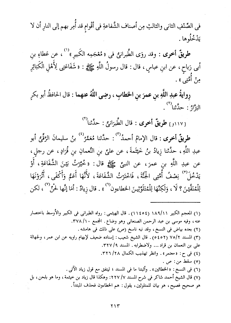 طَرِيقٌ أُخْرَى: قَالَ الْإِمَامُ أَحْمَدُ: حَدَّثَنَا مَعْمَرُ بْنُ سُلَيْمَانَ الرَّقِّيُّ أَبُو عَبْدِ اللَّهِ، حَدَّثَنَا زِيَادُ بْنُ خَيْثَمَةَ، عَنْ عَلِيِّ بْنِ النُّعْمَانِ بْنِ قُرَادٍ، عَنْ رَجُلٍ، عَنْ عَبْدِ اللَّهِ بْنِ عُمَرَ، عَنِ النَّبِيِّ صَلَّى اللَّهُ عَلَيْهِ وَسَلَّمَ قَالَ: " «خُيِّرْتُ بَيْنَ الشَّفَاعَةِ، أَوْ يَدْخُلَ نِصْفُ أُمَّتِي الْجَنَّةَ، فَاخْتَرْتُ الشَّفَاعَةَ، لِأَنَّهَا أَعَمُّ وَأَكْفَى، أَتُرَوْنَهَا لِلْمُنَقَّيْنَ؟ لَا، وَلَكِنَّهَا لِلْمُتَلَوِّثِينَ الْخَطَّاءُونَ» ". قَالَ زِيَادٌ: أَمَا إِنَّهَا لَحْنٌ، لَكِنْ
