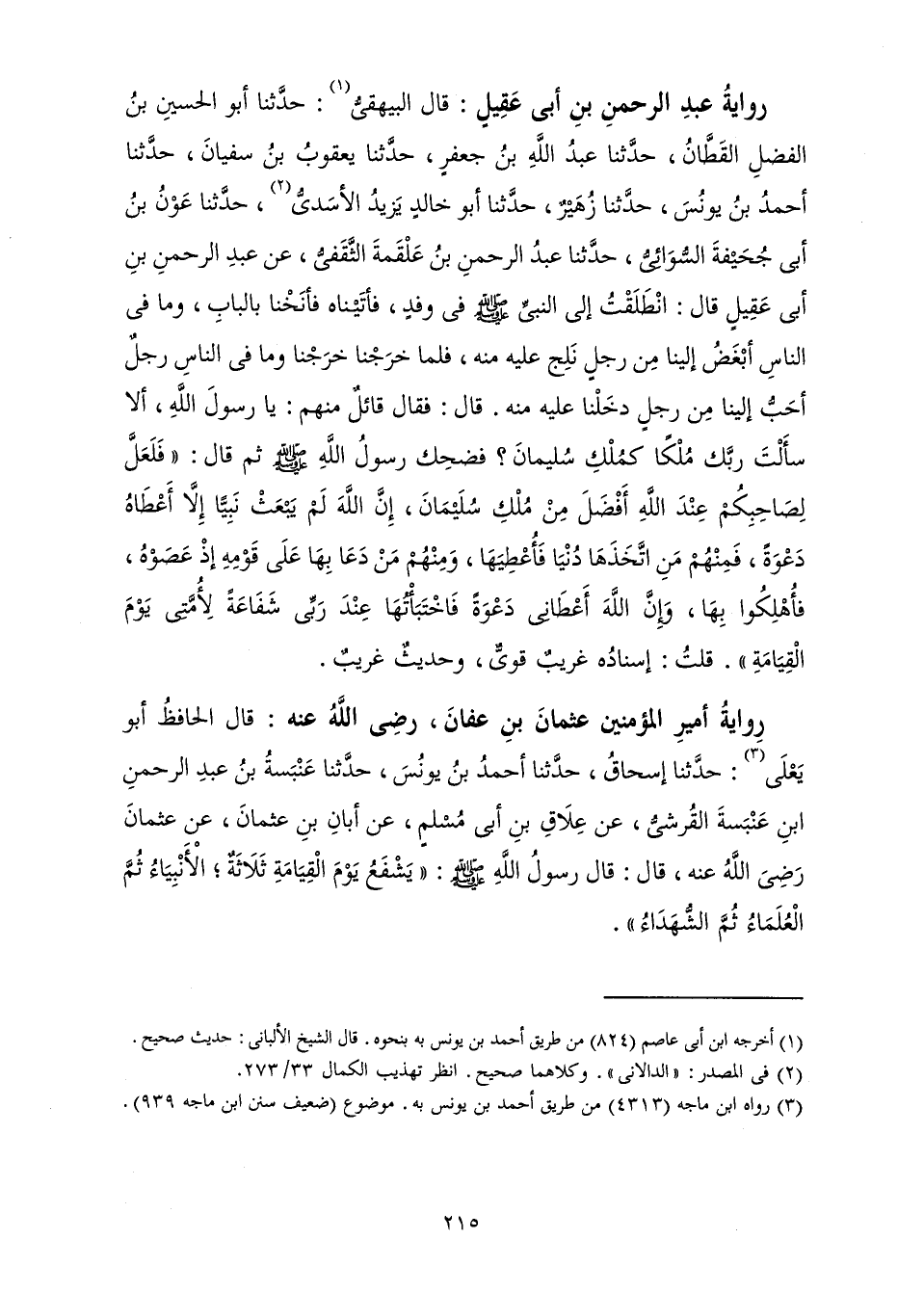 ٍ: قَالَ الْبَيْهَقِيُّ: حَدَّثَنَا أَبُو الْحُسَيْنِ بْنُ الْفَضْلِ الْقَطَّانُ، حَدَّثَنَا عَبْدُ اللَّهِ بْنُ جَعْفَرٍ، حَدَّثَنَا يَعْقُوبُ بْنُ سُفْيَانَ، حَدَّثَنَا أَحْمَدُ بْنُ يُونُسَ، حَدَّثَنَا زُهَيْرٌ، حَدَّثَنَا أَبُو خَالِدٍ يَزِيدُ الْأَسَدِيُّ، حَدَّثَنَا عَوْنُ بْنُ أَبِي جُحَيْفَةَ السُّوَائِيُّ، حَدَّثَنَا عَبْدُ الرَّحْمَنِ بْنُ عَلْقَمَةَ الثَّقَفِيُّ، عَنْ عَبْدِ الرَّحْمَنِ بْنِ أَبِي عَقِيلٍ قَالَ: «انْطَلَقْتُ إِلَى النَّبِيِّ صَلَّى اللَّهُ عَلَيْهِ وَسَلَّمَ فِي وَفْدٍ، فَأَتَيْنَاهُ فَأَنَخْنَا بِالْبَابِ، وَمَا فِي النَّاسِ أَبْغَضُ إِلَيْنَا مِنْ رَجُلٍ نَلِجُ عَلَيْهِ مِنْهُ، فَلَمَّا خَرَجْنَا خَرَجْنَا وَمَا فِي النَّاسِ رَجُلٌ أَحَبُّ إِلَيْنَا مِنْ رَجُلٍ دَخَلْنَا عَلَيْهِ مِنْهُ. قَالَ: فَقَالَ قَائِلٌ مِنْهُمْ: يَا رَسُولَ اللَّهِ، أَلَا سَأَلْتَ رَبَّكَ مُلْكًا كَمُلْكِ سُلَيْمَانَ؟ فَضْحِكَ رَسُولُ اللَّهِ صَلَّى اللَّهُ عَلَيْهِ وَسَلَّمَ ثُمَّ قَالَ: " فَلَعَلَّ لِصَاحِبِكُمْ عِنْدَ اللَّهِ أَفْضَلَ مِنْ مُلْكِ سُلَيْمَانَ، إِنَّ اللَّهَ لَمْ يَبْعَثْ نَبِيًّا إِلَّا أَعْطَاهُ دَعْوَةً، فَمِنْهُمْ مَنِ اتَّخَذَهَا دُنْيَا فَأُعْطِيَهَا، وَمِنْهُمْ مَنْ دَعَا بِهَا عَلَى قَوْمِهِ إِذْ عَصَوْهُ، فَأُهْلِكُوا بِهَا، وَإِنَّ اللَّهَ أَعْطَانِي دَعْوَةً فَاخْتَبَأْتُهَا عِنْدَ رَبِّي شَفَاعَةً لِأُمَّتِي يَوْمَ الْقِيَامَةِ» ". قُلْتُ: إِسْنَادُهُ غَرِيبٌ قَوِيٌّ، وَحَدِيثٌ غَرِيبٌ.