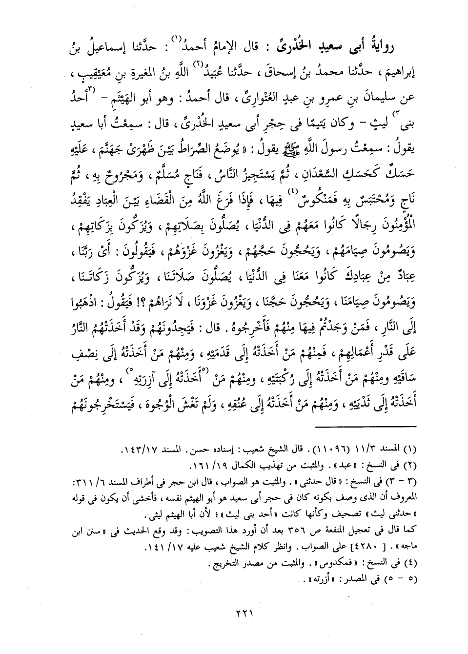 ِّ: قَالَ الْإِمَامُ أَحْمَدُ: حَدَّثَنَا إِسْمَاعِيلُ بْنُ إِبْرَاهِيمَ، حَدَّثَنَا مُحَمَّدُ بْنُ إِسْحَاقَ، حَدَّثَنَا عُبَيْدُ اللَّهِ بْنُ الْمُغِيرَةِ بْنِ مُعَيْقِيبٍ، عَنْ سُلَيْمَانَ بْنِ عَمْرِو بْنِ عَبْدٍ الْعُتْوَارِيِّ، قَالَ أَحْمَدُ: وَهُوَ أَبُو الْهَيْثَمِ - أَحَدُ بَنِي لَيْثٍ - وَكَانَ يَتِيمًا فِي حِجْرِ أَبِي سَعِيدٍ الْخُدْرِيِّ، قَالَ: سَمِعْتُ أَبَا سَعِيدٍ يَقُولُ: سَمِعْتُ رَسُولَ اللَّهِ صَلَّى اللَّهُ عَلَيْهِ وَسَلَّمَ يَقُولُ: " «يُوضَعُ الصِّرَاطُ بَيْنَ ظَهْرَيْ جَهَنَّمَ، عَلَيْهِ حَسَكٌ كَحَسَكِ السَّعْدَانِ، ثُمَّ يَسْتَجِيزُ النَّاسُ، فَنَاجٍ مُسَلَّمٌ، وَمَجْرُوحٌ بِهِ، ثُمَّ نَاجٍ وَمُحْتَبَسٌ بِهِ فَمَنْكُوسٌ فِيهَا، فَإِذَا فَرَغَ اللَّهُ مِنَ الْقَضَاءِ بَيْنَ الْعِبَادِ يَفْقِدُ الْمُؤْمِنُونَ رِجَالًا كَانُوا مَعَهُمْ فِي الدُّنْيَا، يُصَلُّونَ بِصَلَاتِهِمْ، وَيُزَكُّونَ بِزَكَاتِهِمْ، وَيَصُومُونَ صِيَامَهُمْ، وَيَحُجُّونَ حَجَّهُمْ، وَيَغْزُونَ غَزْوَهُمْ، فَيَقُولُونَ: أَيْ رَبَّنَا، عِبَادٌ مِنْ عِبَادِكَ كَانُوا مَعَنَا فِي الدُّنْيَا، يُصَلُّونَ صَلَاتَنَا، وَيُزَكُّونَ زَكَاتَنَا، وَيَصُومُونَ صِيَامَنَا، وَيَحُجُّونَ حَجَّنَا، وَيَغْزُونَ غَزْوَنَا، لَا نَرَاهُمْ؟! فَيَقُولُ: اذْهَبُوا إِلَى النَّارِ، فَمَنْ وَجَدْتُمْ فِيهَا مِنْهُمْ فَأَخْرِجُوهُ. قَالَ: فَيَجِدُونَهُمْ وَقَدْ أَخَذَتْهُمُ النَّارُ عَلَى قَدْرِ أَعْمَالِهِمْ، فَمِنْهُمْ مَنْ أَخَذَتْهُ إِلَى قَدَمَيْهِ، وَمِنْهُمْ مَنْ أَخَذَتْهُ إِلَى نِصْفِ سَاقَيْهِ وَمِنْهُمْ مَنْ أَخَذَتْهُ إِلَى رُكْبَتِهِ، وَمِنْهُمْ مَنْ أَخَذَتْهُ إِلَى آزِرَتِهِ، وَمِنْهُمْ مَنْ أَخَذَتْهُ إِلَى ثَدْيَيْهِ، وَمِنْهُمْ مَنْ أَخَذَتْهُ إِلَى عُنُقِهِ، وَلَمْ تَغْشَ الْوُجُوهَ، فَيَسْتَخْرِجُونَهُمْ