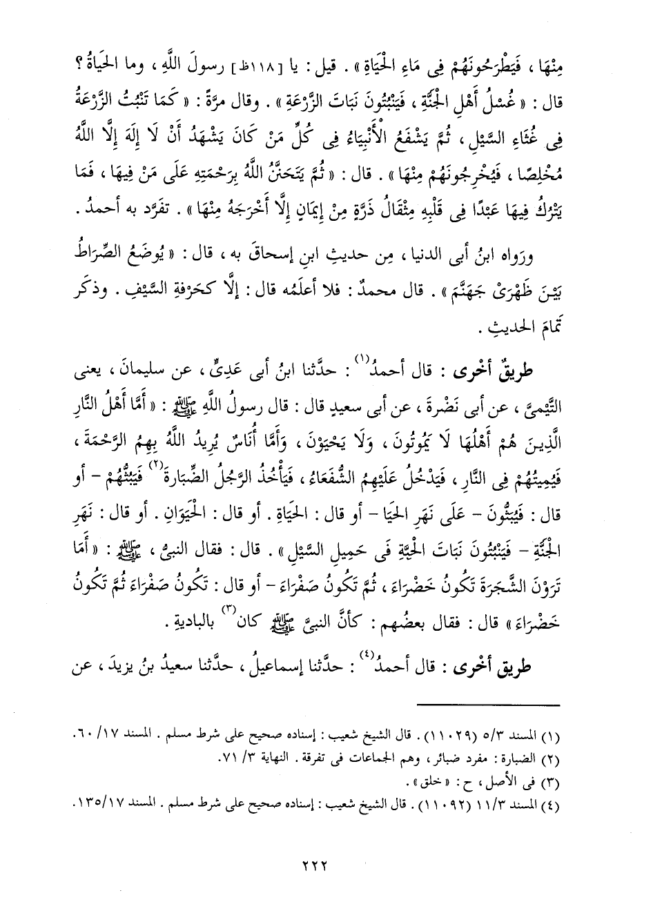 طَرِيقٌ أُخْرَى: قَالَ أَحْمَدُ: حَدَّثَنَا ابْنُ أَبِي عَدِيٍّ، عَنْ سُلَيْمَانَ، يَعْنِي التَّيْمِيَّ، عَنْ أَبِي نَضْرَةَ، عَنْ أَبِي سَعِيدٍ قَالَ: قَالَ رَسُولُ اللَّهِ صَلَّى اللَّهُ عَلَيْهِ وَسَلَّمَ: " «أَمَّا أَهْلُ النَّارِ الَّذِينَ هُمْ أَهْلُهَا لَا يَمُوتُونَ، وَلَا يَحْيَوْنَ، وَأَمَّا أُنَاسٌ يُرِيدُ اللَّهُ بِهِمُ الرَّحْمَةَ، فَيُمِيتُهُمْ فِي النَّاسِ، فَيَدْخُلُ عَلَيْهِمُ الشُّفَعَاءُ، فَيَأْخُذُ الرَجُلُ الضِّبَارَةَ فَيَبُثُّهُمْ - أَوْ قَالَ: فَيُبَثُّونَ - عَلَى نَهَرِ الْحَيَا - أَوْ " قَالَ: الْحَيَاةِ. أَوْ قَالَ: الْحَيَوَانِ. أَوْ قَالَ: نَهَرِ الْجَنَّةِ - فَيَنْبُتُونَ نَبَاتَ الْحَبَّةِ فِي حَمِيلِ السَّيْلِ ". قَالَ: فَقَالَ النَّبِيُّ صَلَّى اللَّهُ عَلَيْهِ وَسِلْمُ،: " أَمَا تَرَوْنَ الشَّجَرَةَ تَكُونُ خَضْرَاءَ، ثُمَّ تَكُونُ صَفْرَاءَ - أَوْ قَالَ: تَكُونُ صَفْرَاءَ ثُمَّ تَكُونُ خَضْرَاءَ " قَالَ: فَقَالَ بَعْضُهُمْ: كَأَنَّ النَّبِيَّ صَلَّى اللَّهُ عَلَيْهِ وَسَلَّمَ كَانَ بِالْبَادِيَةِ» .