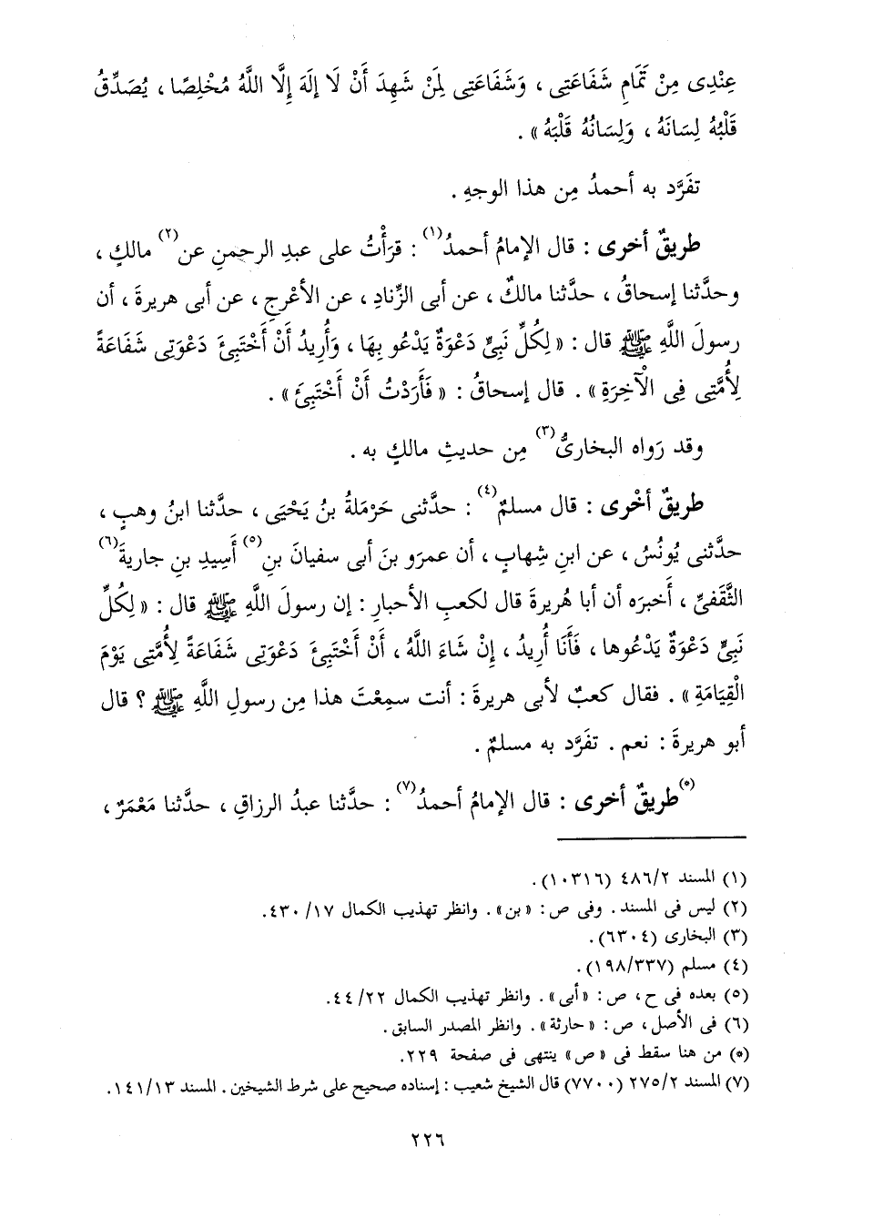 طَرِيقٌ أُخْرَى: قَالَ الْإِمَامُ أَحْمَدُ: قَرَأْتُ عَلَى عَبْدِ الرَّحْمَنِ عَنْ مَالِكٍ، وَحَدَّثَنَا إِسْحَاقُ، حَدَّثَنَا مَالِكٌ، عَنْ أَبِي الزِّنَادِ، عَنِ الْأَعْرَجِ، عَنْ أَبِي هُرَيْرَةَ، أَنَّ رَسُولَ اللَّهِ صَلَّى اللَّهُ عَلَيْهِ وَسَلَّمَ قَالَ: " «لِكُلِّ نَبِيٍّ دَعْوَةٌ يَدْعُو بِهَا، وَأُرِيدُ أَنْ أَخْتَبِئَ دَعْوَتِي شَفَاعَةً لِأُمَّتِي فِي الْآخِرَةِ» ". قَالَ إِسْحَاقُ: " فَأَرَدْتُ أَنْ أَخْتَبِئَ ".