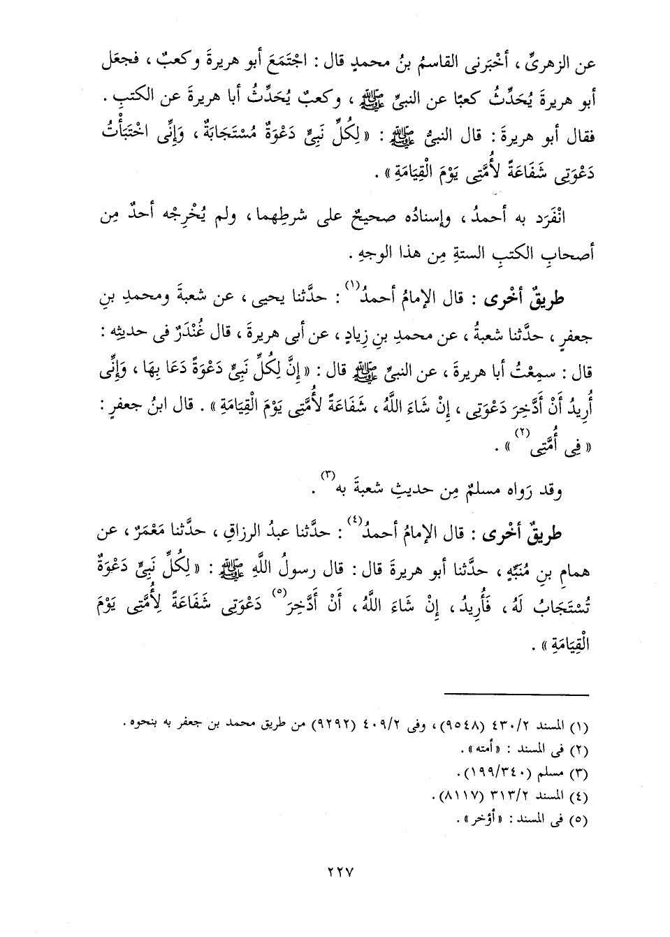 طَرِيقٌ أُخْرَى: قَالَ الْإِمَامُ أَحْمَدُ: حَدَّثَنَا عَبْدُ الرَّزَّاقِ، حَدَّثَنَا مَعْمَرٌ، عَنْ هَمَّامِ بْنِ مُنَبِّهٍ، حَدَّثَنَا أَبُو هُرَيْرَةَ قَالَ: قَالَ رَسُولُ اللَّهِ صَلَّى اللَّهُ عَلَيْهِ وَسَلَّمَ: " «لِكُلِّ نَبِيٍّ دَعْوَةٌ تُسْتَجَابُ لَهُ، فَأُرِيدُ، إِنْ شَاءَ اللَّهُ، أَنْ أَدَّخِرَ دَعْوَتِي شَفَاعَةً لِأُمَّتِي يَوْمَ الْقِيَامَةِ» ".