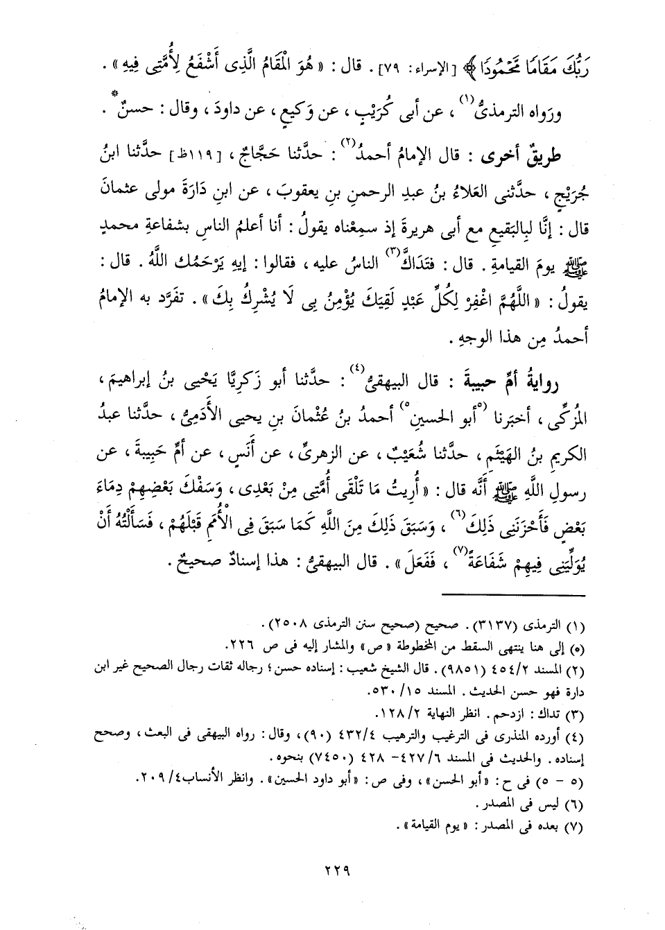 َ: قَالَ الْبَيْهَقِيُّ: حَدَّثَنَا أَبُو زَكَرِيَّا يَحْيَى بْنُ إِبْرَاهِيمَ الْمُزَكِّي، أَخْبَرَنَا أَبُو الْحُسَيْنِ أَحْمَدُ بْنُ عُثْمَانَ بْنِ يَحْيَى الْأَدَمِيُّ، حَدَّثَنَا عَبْدُ الْكَرِيمِ بْنُ الْهَيْثَمِ، حَدَّثَنَا شُعَيْبٌ، عَنِ الزُّهْرِيِّ، عَنْ أَنَسٍ، عَنْ أُمِّ حَبِيبَةَ، عَنْ رَسُولِ اللَّهِ صَلَّى اللَّهُ عَلَيْهِ وَسَلَّمَ أَنَّهُ قَالَ: " «أُرِيتُ مَا تَلْقَى أُمَّتِي مِنْ بَعْدِي، وَسَفْكَ بَعْضِهِمْ دِمَاءَ بَعْضٍ فَأَحْزَنَنِي ذَلِكَ، وَسَبَقَ ذَلِكَ مِنَ اللَّهِ كَمَا سَبَقَ فِي الْأُمَمِ قَبْلَهُمْ، فَسَأَلْتُهُ أَنْ يُوَلِّيَنِي فِيهِمْ شَفَاعَةً، فَفَعَلَ» ". قَالَ الْبَيْهَقِيُّ: هَذَا إِسْنَادٌ صَحِيحٌ.