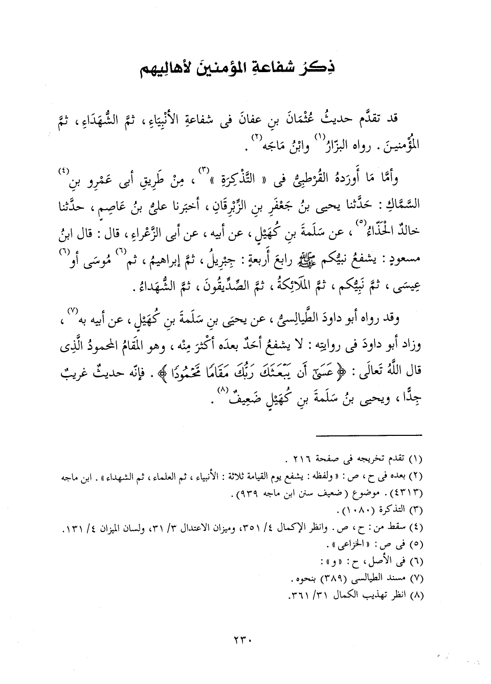 قَدْ تَقَدَّمَ حَدِيثُ عُثْمَانَ بْنِ عَفَّانَ فِي شَفَاعَةِ الْأَنْبِيَاءِ، ثُمَّ الشُّهَدَاءِ، ثُمَّ الْمُؤْمِنِينَ. رَوَاهُ الْبَزَّارُ وَابْنُ مَاجَهْ.