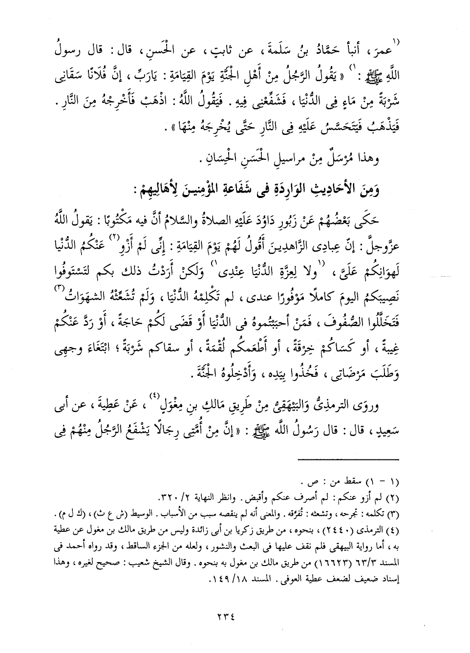 عُمْرَ، أَنْبَأَ حَمَّادُ بْنُ سَلَمَةَ، عَنْ ثَابِتٍ، عَنِ الْحَسَنِ، قَالَ: قَالَ رَسُولُ اللَّهِ صَلَّى اللَّهُ عَلَيْهِ وَسَلَّمَ: " «يَقُولُ الرَّجُلُ مِنْ أَهْلِ الْجَنَّةِ يَوْمَ الْقِيَامَةِ: يَا رَبِّ، إِنَّ فُلَانًا سَقَانِي شَرْبَةً مِنْ مَاءٍ فِي الدُّنْيَا، فَشَفِّعْنِي فِيهِ. فَيَقُولُ اللَّهُ: اذْهَبْ فَأَخْرِجْهُ مِنَ النَّارِ. فَيَذْهَبُ فَيَتَحَسَّسُ عَلَيْهِ فِي النَّارِ حَتَّى يُخْرِجَهُ مِنْهَا» ".