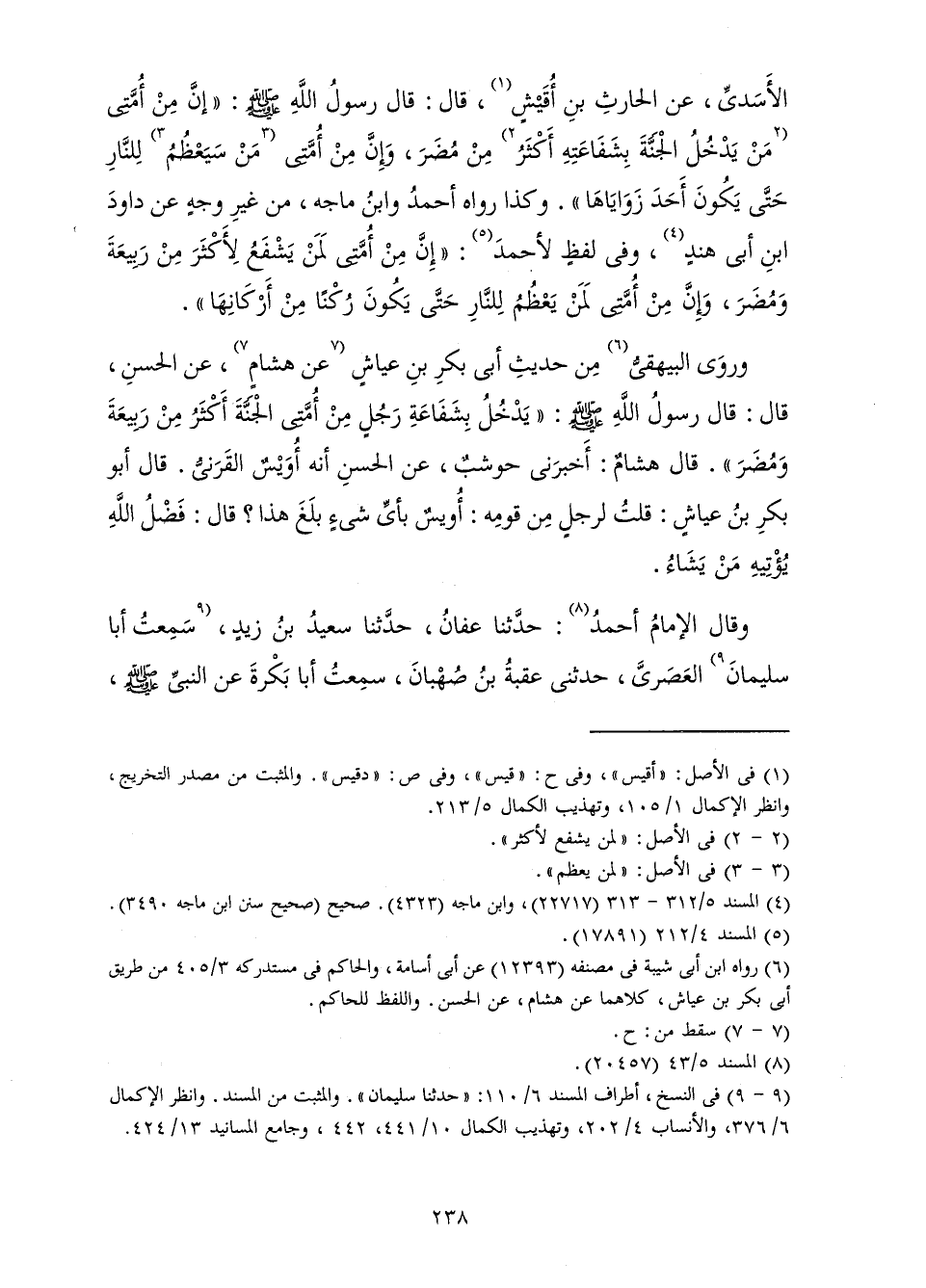 الْأَسَدِيِّ، عَنِ الْحَارِثِ بْنِ أُقَيْشٍ، قَالَ: قَالَ رَسُولُ اللَّهِ صَلَّى اللَّهُ عَلَيْهِ وَسَلَّمَ: " «إِنَّ مِنْ أُمَّتِي مَنْ يَدْخُلُ الْجَنَّةَ بِشَفَاعَتِهِ أَكْثَرُ مِنْ مُضَرَ، وَإِنَّ مِنْ أُمَّتِي مَنْ سَيَعْظُمُ لِلنَّارِ حَتَّى يَكُونَ أَحَدَ زَوَايَاهَا» ". وَكَذَا رَوَاهُ أَحْمَدُ وَابْنُ مَاجَهْ، مِنْ غَيْرِ وَجْهٍ عَنْ دَاوُدَ بْنِ أَبِي هِنْدٍ، وَفِي لَفْظٍ لِأَحْمَدَ: " «إِنَّ مِنْ أُمَّتِي لَمَنْ يَشْفَعُ لِأَكْثَرَ مِنْ رَبِيعَةَ وَمُضَرَ، وَإِنَّ مِنْ أُمَّتِي لَمَنْ يَعْظُمُ لِلنَّارِ حَتَّى يَكُونَ رُكْنًا مِنْ أَرْكَانِهَا» ".