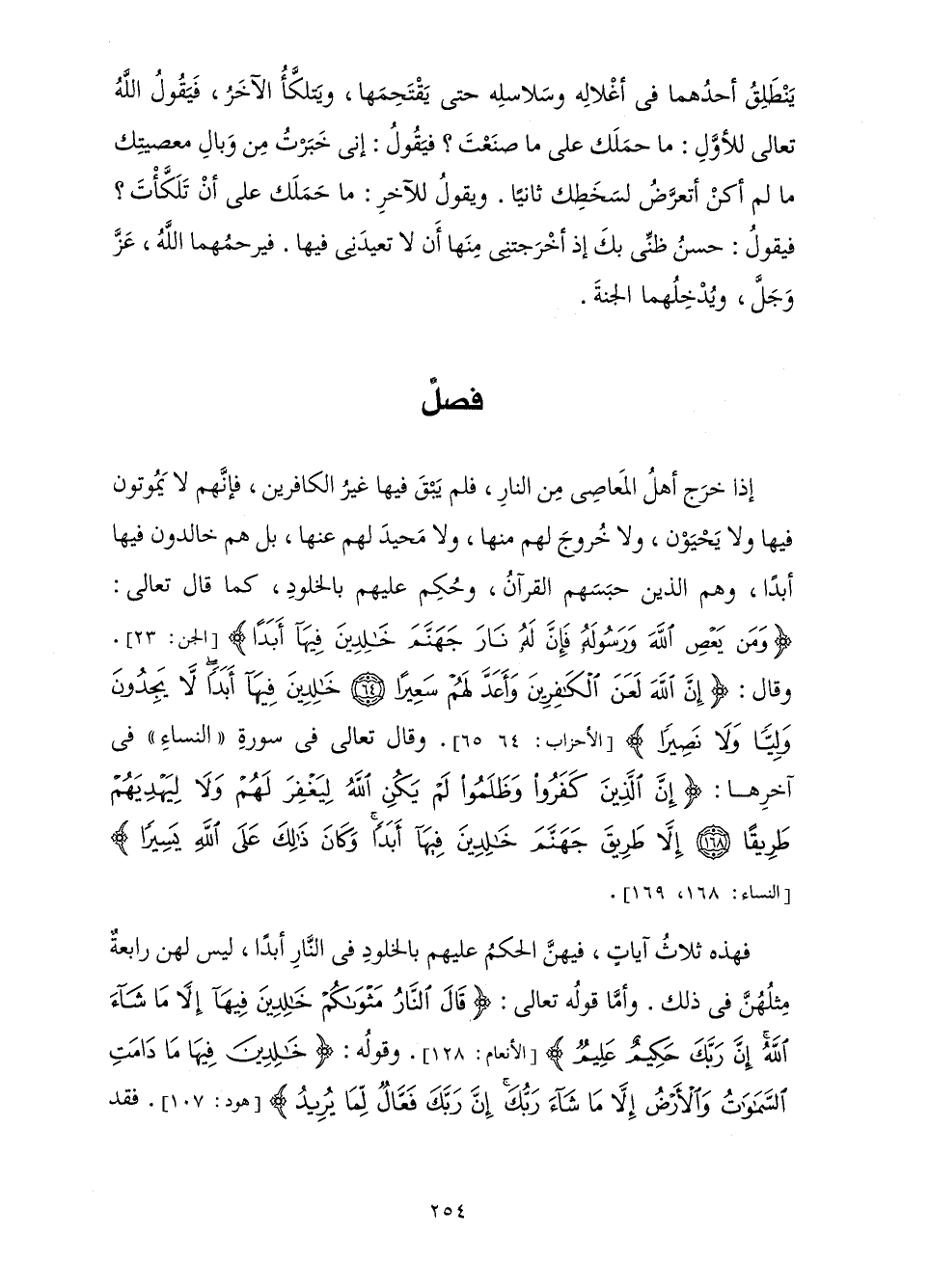 إِذَا خَرَجَ أَهْلُ الْمَعَاصِي مِنَ النَّارِ، فَلَمْ يَبْقَ فِيهَا غَيْرُ الْكَافِرِينَ، فَإِنَّهُمْ لَا يَمُوتُونَ فِيهَا وَلَا يَحْيَوْنَ، وَلَا خُرُوجَ لَهُمْ مِنْهَا، وَلَا مَحِيدَ لَهُمْ عَنْهَا، بَلْ هُمْ خَالِدُونَ فِيهَا أَبَدًا، وَهُمُ الَّذِينَ حَبَسَهُمُ الْقُرْآنُ، وَحُكِمَ عَلَيْهِمْ بِالْخُلُودِ، كَمَا قَالَ تَعَالَى: {وَمَنْ يَعْصِ اللَّهَ وَرَسُولَهُ فَإِنَّ لَهُ نَارَ جَهَنَّمَ خَالِدِينَ فِيهَا أَبَدًا} [الجن: 23] . وَقَالَ: {إِنَّ اللَّهَ لَعَنَ الْكَافِرِينَ وَأَعَدَّ لَهُمْ سَعِيرًا خَالِدِينَ فِيهَا أَبَدًا لَا يَجِدُونَ وَلِيًّا وَلَا نَصِيرًا} [الأحزاب: 64]
