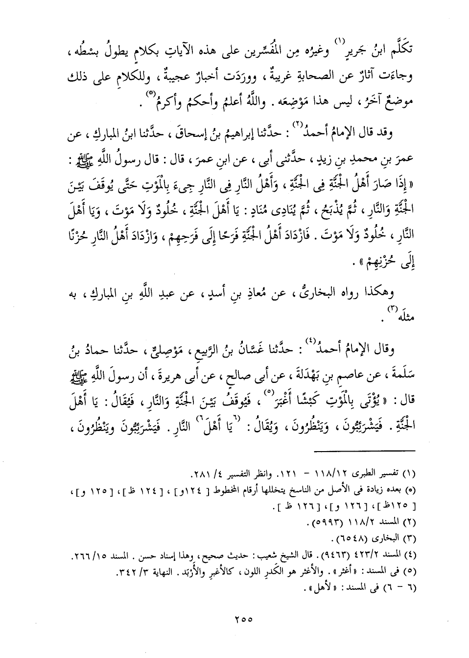وَقَدْ قَالَ الْإِمَامُ أَحْمَدُ: حَدَّثَنَا إِبْرَاهِيمُ بْنُ إِسْحَاقَ، حَدَّثَنَا ابْنُ الْمُبَارَكِ، عَنْ عُمَرَ بْنِ مُحَمَّدِ بْنِ زَيْدٍ، حَدَّثَنِي أَبِي، عَنِ ابْنِ عُمَرَ، قَالَ: قَالَ رَسُولُ اللَّهِ صَلَّى اللَّهُ عَلَيْهِ وَسَلَّمَ: " «إِذَا صَارَ أَهْلُ الْجَنَّةِ فِي الْجَنَّةِ، وَأَهْلُ النَّارِ فِي النَّارِ جِيءَ بِالْمَوْتِ حَتَّى يُوقَفَ بَيْنَ الْجَنَّةِ وَالنَّارِ، ثُمَّ يُذْبَحُ، ثُمَّ يُنَادِي مُنَادٍ: يَا أَهْلَ الْجَنَّةِ، خُلُودٌ وَلَا مَوْتَ، وَيَا أَهْلَ النَّارِ، خُلُودٌ وَلَا مَوْتَ. فَازْدَادَ أَهْلُ الْجَنَّةِ فَرَحًا إِلَى فَرَحِهِمْ، وَازْدَادَ أَهْلُ النَّارِ حُزْنًا إِلَى حُزْنِهِمْ» ".