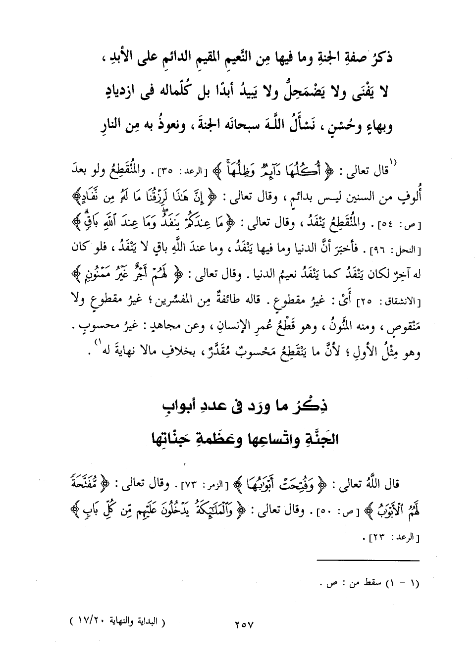 قَالَ تَعَالَى: {أُكُلُهَا دَائِمٌ وَظِلُّهَا} [الرعد: 35] . وَالْمُنْقَطِعُ وَلَوْ بَعْدَ أُلُوفٍ مِنَ السِّنِينَ لَيْسَ بِدَائِمٍ، وَقَالَ تَعَالَى: {إِنَّ هَذَا لَرِزْقُنَا مَا لَهُ مِنْ نَفَادٍ} [ص: 54] . وَالْمُنْقَطِعُ يَنْفَدُ، وَقَالَ تَعَالَى: {مَا عِنْدَكُمْ يَنْفَدُ وَمَا عِنْدَ اللَّهِ بَاقٍ} [النحل: 96] . فَأَخْبَرَ أَنَّ الدُّنْيَا وَمَا فِيهَا يَنْفَدُ، وَمَا عِنْدَ اللَّهِ بَاقٍ لَا يَنْفَدُ، فَلَوْ كَانَ لَهُ آخِرٌ لَكَانَ يَنْفَدُ كَمَا يَنْفَدُ نَعِيمُ الدُّنْيَا. وَقَالَ تَعَالَى: {لَهُمْ أَجْرٌ غَيْرُ مَمْنُونٍ} [الانشقاق: 25] أَيْ: غَيْرُ مَقْطُوعٍ. قَالَهُ طَائِفَةٌ مِنَ الْمُفَسِّرِينَ ; غَيْرُ مَقْطُوعٍ وَلَا مَنْقُوصٍ، وَمِنْهُ الْمَنُونُ، وَهُوَ قَطْعُ عُمُرِ الْإِنْسَانِ، وَعَنْ مُجَاهِدٍ: غَيْرُ مَحْسُوبٍ. وَهُوَ مِثْلُ الْأَوَّلِ ; لِأَنَّ مَا يَنْقَطِعُ مَحْسُوبٌ مُقَدَّرٌ، بِخِلَافِ مَا لَا نِهَايَةَ لَهُ.