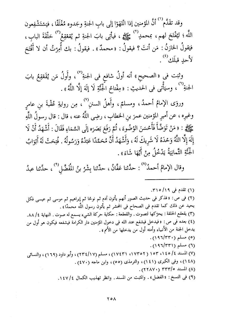 وَقَدْ تَقَدَّمَ أَنَّ الْمُؤْمِنِينَ إِذَا انْتَهَوْا إِلَى بَابِ الْجَنَّةِ وَجَدُوهُ مُغْلَقًا، فَيَسْتَشْفِعُونَ اللَّهَ ; لِيُفْتَحَ لَهُمْ، بِمُحَمَّدٍ صَلَّى اللَّهُ عَلَيْهِ وَسَلَّمَ، فَيَأْتِي بَابَ الْجَنَّةِ ثُمَّ يُقَعْقِعُ حَلْقَةَ الْبَابِ، فَيَقُولُ الْخَازِنُ: مَنْ أَنْتَ؟ فَيَقُولُ: " مُحَمَّدٌ ". فَيَقُولُ: بِكَ أُمِرْتُ أَنْ لَا أَفْتَحَ لِأَحَدٍ قَبْلَكَ.