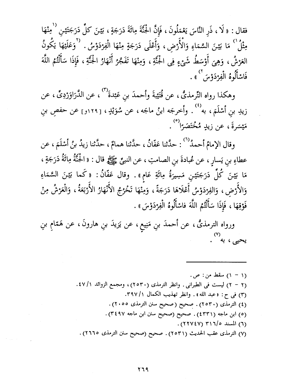 وَقَالَ الْإِمَامُ أَحْمَدُ: حَدَّثَنَا عَفَّانُ، حَدَّثَنَا هَمَّامٌ، حَدَّثَنَا زَيْدُ بْنُ أَسْلَمَ، عَنْ عَطَاءِ بْنِ يَسَارٍ، عَنْ عُبَادَةَ بْنِ الصَّامِتِ، عَنِ النَّبِيِّ صَلَّى اللَّهُ عَلَيْهِ وَسَلَّمَ قَالَ: " «الْجَنَّةُ مِائَةُ دَرَجَةٍ، مَا بَيْنَ كُلِّ دَرَجَتَيْنِ مَسِيرَةُ مِائَةِ عَامٍ ". وَقَالَ عَفَّانُ: " كَمَا بَيْنَ السَّمَاءِ وَالْأَرْضِ، وَالْفِرْدَوْسُ أَعْلَاهَا دَرَجَةً، وَمِنْهَا تَخْرُجُ الْأَنْهَارُ الْأَرْبَعَةُ، وَالْعَرْشُ مِنْ فَوْقِهَا، فَإِذَا سَأَلْتُمُ اللَّهَ فَاسْأَلُوهُ الْفِرْدَوْسَ» ".