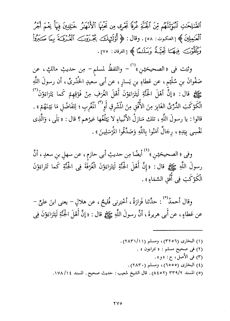 وَثَبَتَ فِي " الصَّحِيحَيْنِ " - وَاللَّفْظُ لِمُسْلِمٍ - مِنْ حَدِيثِ مَالِكٍ، عَنْ صَفْوَانَ بْنِ سُلَيْمٍ، عَنْ عَطَاءِ بْنِ يَسَارٍ، عَنْ أَبِي سَعِيدٍ الْخُدْرِيِّ، أَنَّ رَسُولَ اللَّهِ صَلَّى اللَّهُ عَلَيْهِ وَسَلَّمَ قَالَ: " «إِنَّ أَهْلَ الْجَنَّةِ لَيَتَرَاءَوْنَ أَهْلَ الْغُرَفِ مِنْ فَوْقِهِمْ كَمَا يَتَرَاءَوْنَ الْكَوْكَبَ الدُّرِّيَّ الْغَابِرَ مِنَ الْأُفُقِ مِنَ الْمَشْرِقِ أَوِ الْمَغْرِبِ ; لِتَفَاضُلِ مَا بَيْنَهُمْ ". قَالُوا: يَا رَسُولَ اللَّهِ، تِلْكَ مَنَازِلُ الْأَنْبِيَاءِ لَا يَبْلُغُهَا غَيْرُهُمْ؟ قَالَ: " بَلَى، وَالَّذِي نَفْسِي بِيَدِهِ، رِجَالٌ آمَنُوا بِاللَّهِ وَصَدَّقُوا الْمُرْسَلِينَ» ".