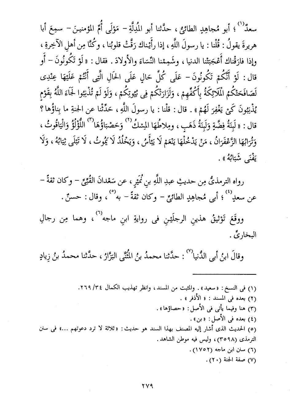 سَعْدٌ ; أَبُو مُجَاهِدٍ الطَّائِيُّ، حَدَّثَنَا أَبُو الْمُدِلَّةِ - مَوْلَى أُمِّ الْمُؤْمِنِينَ - سَمِعَ أَبَا هُرَيْرَةَ يَقُولُ: «قُلْنَا: يَا رَسُولَ اللُّهِ، إِذَا رَأَيْنَاكَ رَقَّتْ قُلُوبُنَا، وَكُنَّا مِنْ أَهْلِ الْآخِرَةِ، وَإِذَا فَارَقْنَاكَ أَعْجَبَتْنَا الدُّنْيَا، وَشَمِمْنَا النِّسَاءَ وَالْأَوْلَادَ. فَقَالَ: " لَوْ تَكُونُونَ - أَوْ قَالَ: لَوْ أَنَّكُمْ تَكُونُونَ - عَلَى كُلِّ حَالٍ عَلَى الْحَالِ الَّتِي أَنْتُمْ عَلَيْهَا عِنْدِي لَصَافَحَتْكُمُ الْمَلَائِكَةُ بِأَكُفِّهِمْ، وَلَزَارَتْكُمْ فِي بُيُوتِكُمْ، وَلَوْ لَمْ تُذْنِبُوا لَجَاءَ اللَّهُ بِقَوْمٍ يُذْنِبُونَ كَيْ يَغْفِرَ لَهُمْ ". قَالَ: قُلْنَا: يَا رَسُولَ اللَّهِ، حَدِّثْنَا عَنِ الْجَنَّةِ مَا بِنَاؤُهَا؟ قَالَ: " لَبِنَةُ فِضَّةٍ وَلَبِنَةُ ذَهَبٍ، وَمِلَاطُهَا الْمِسْكُ وَحَصْبَاؤُهَا اللُّؤْلُؤُ وَالْيَاقُوتُ، وَتُرَابُهَا الزَّعْفَرَانُ، مَنْ يَدْخُلُهَا يَنْعَمُ لَا يَبْأَسُ، وَيَخْلُدُ لَا يَمُوتُ، لَا تَبْلَى ثِيَابُهُ، وَلَا يَفْنَى شَبَابُهُ» ". رَوَاهُ التِّرْمِذِيُّ مِنْ حَدِيثِ عَبْدِ اللَّهِ بْنِ نُمَيْرٍ، عَنْ سَعْدَانَ الْقُبِّيِّ - وَكَانَ ثِقَةً - عَنْ سَعْدٍ ; أَبِي مُجَاهِدٍ الطَّائِيِّ - وَكَانَ ثِقَةً - بِهِ، وَقَالَ: حَسَنٌ.