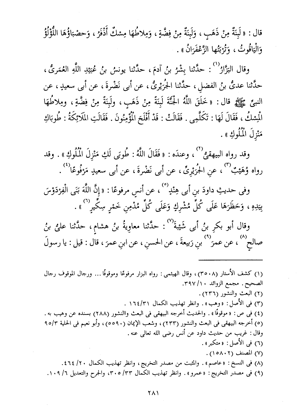 وَقَالَ الْبَزَّارُ: حَدَّثَنَا بِشْرُ بْنُ آدَمَ، حَدَّثَنَا يُونُسُ بْنُ عُبَيْدِ اللَّهِ الْعُمَرِيُّ، حَدَّثَنَا عَدِيُّ بْنُ الْفَضْلِ، حَدَّثَنَا الْجُرَيْرِيُّ، عَنْ أَبِي نَضْرَةَ، عَنْ أَبِي سَعِيدٍ، عَنِ النَّبِيِّ صَلَّى اللَّهُ عَلَيْهِ وَسَلَّمَ قَالَ: " «خَلَقَ اللَّهُ الْجَنَّةَ لَبِنَةً مِنْ ذَهَبٍ، وَلَبِنَةً مِنْ فِضَّةٍ، وَمِلَاطُهَا الْمِسْكُ، فَقَالَ لَهَا: تَكَلَّمِي. فَقَالَتْ: قَدْ أَفْلَحَ الْمُؤْمِنُونَ. فَقَالَتِ الْمَلَائِكَةُ: طُوبَاكِ مَنْزِلَ الْمُلُوكِ» ".