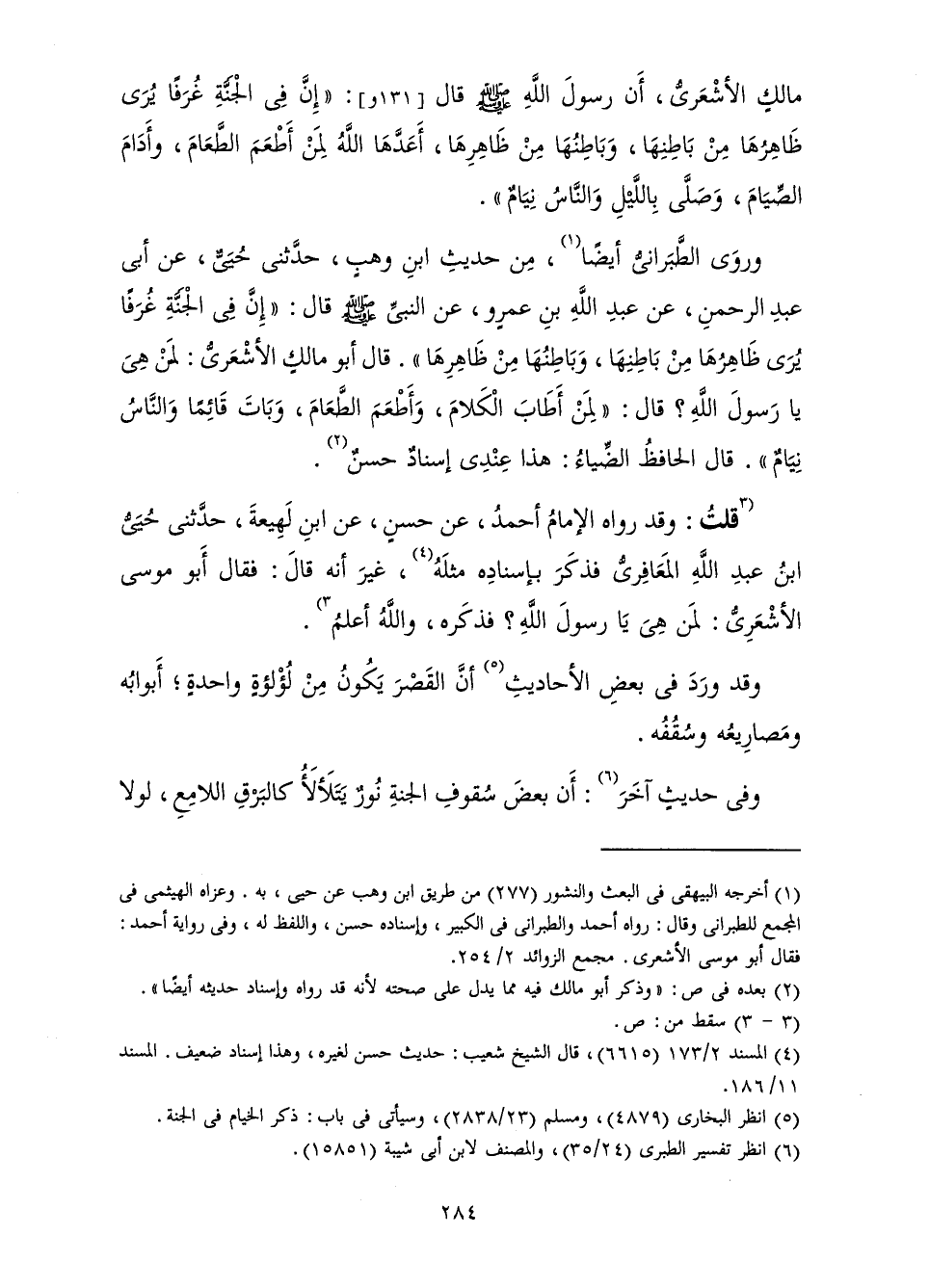 وَرَوَى الطَّبَرَانِيُّ أَيْضًا، مِنْ حَدِيثِ ابْنِ وَهْبٍ، حَدَّثَنِي حُيَيٌّ، عَنْ أَبِي عَبْدِ الرَّحْمَنِ، عَنْ عَبْدِ اللَّهِ بْنِ عَمْرٍو، عَنِ النَّبِيِّ صَلَّى اللَّهُ عَلَيْهِ وَسَلَّمَ قَالَ: «إِنَّ فِي الْجَنَّةِ غُرَفًا يُرَى ظَاهِرُهَا مِنْ بَاطِنِهَا، وَبَاطِنُهَا مِنْ ظَاهِرِهَا ". قَالَ أَبُو مَالِكٍ الْأَشْعَرِيُّ: لِمَنْ هِيَ يَا رَسُولَ اللَّهِ؟ قَالَ: " لِمَنْ أَطَابَ الْكَلَامَ، وَأَطْعَمَ الطَّعَامَ، وَبَاتَ قَائِمًا وَالنَّاسُ نِيَامٌ» ". قَالَ الْحَافِظُ الضِّيَاءُ؟ هَذَا عِنْدِي إِسْنَادٌ حَسَنٌ.