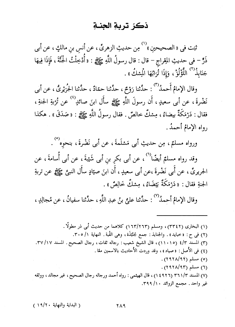 ثَبَتَ فِي " الصَّحِيحَيْنِ " مِنْ حَدِيثِ الزُّهْرِيِّ، عَنْ أَنَسِ بْنِ مَالِكٍ، عَنْ أَبِي ذَرٍّ - فِي حَدِيثِ الْمِعْرَاجِ - قَالَ: قَالَ رَسُولُ اللَّهِ صَلَّى اللَّهُ عَلَيْهِ وَسَلَّمَ: " «أُدْخِلْتُ الْجَنَّةَ، فَإِذَا فِيهَا جَنَابِذُ اللُّؤْلُؤِ، وَإِذَا تُرَابُهَا الْمِسْكُ» ".