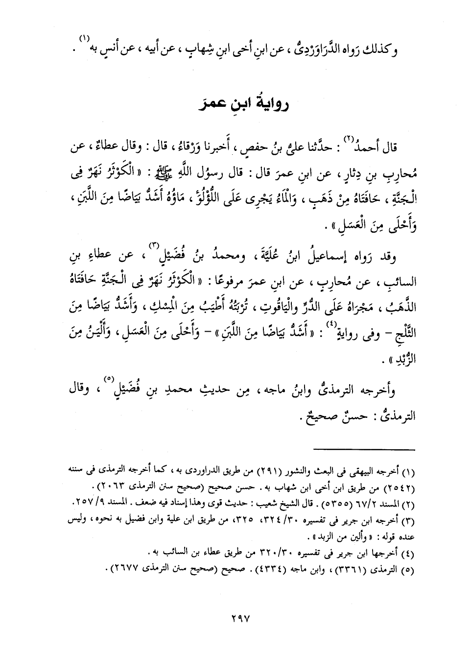 قَالَ أَحْمَدُ: حَدَّثَنَا عَلِيُّ بْنُ حَفْصٍ، أَخْبَرَنَا وَرْقَاءُ، قَالَ: وَقَالَ عَطَاءٌ، عَنْ مُحَارِبِ بْنِ دِثَارٍ، عَنِ ابْنِ عُمَرَ قَالَ: قَالَ رَسُولُ اللَّهِ صَلَّى اللَّهُ عَلَيْهِ وَسَلَّمَ: " «الْكَوْثَرُ نَهَرٌ فِي الْجَنَّةِ، حَافَتَاهُ مِنْ ذَهَبٍ، وَالْمَاءُ يَجْرِي عَلَى اللُّؤْلُؤِ، مَاؤُهُ أَشَدُّ بَيَاضًا مِنَ اللَّبَنِ، وَأَحْلَى مِنَ الْعَسَلِ» ".
