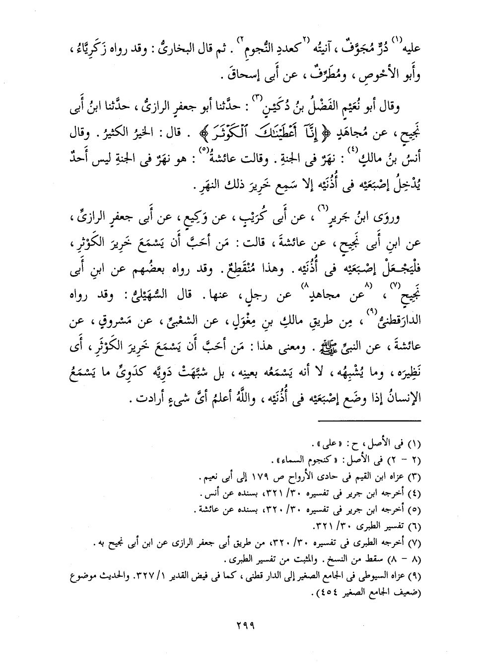 وَقَالَ أَبُو نُعَيْمٍ الْفَضْلُ بْنُ دُكَيْنٍ: حَدَّثَنَا أَبُو جَعْفَرٍ الرَّازِيُّ، حَدَّثَنَا ابْنُ أَبِي نَجِيحٍ، عَنْ مُجَاهَدٍ {إِنَّا أَعْطَيْنَاكَ الْكَوْثَرَ} [الكوثر: 1] . قَالَ: الْخَيْرُ الْكَثِيرُ. وَقَالَ أَنَسُ بْنُ مَالِكٍ: نَهَرٌ فِي الْجَنَّةِ. وَقَالَتْ عَائِشَةُ: هُوَ نَهَرٌ فِي الْجَنَّةِ لَيْسَ أَحَدٌ يُدْخِلُ إِصْبَعَيْهِ فِي أُذُنَيْهِ إِلَّا سَمِعَ خَرِيرَ ذَلِكَ النَهَرِ.