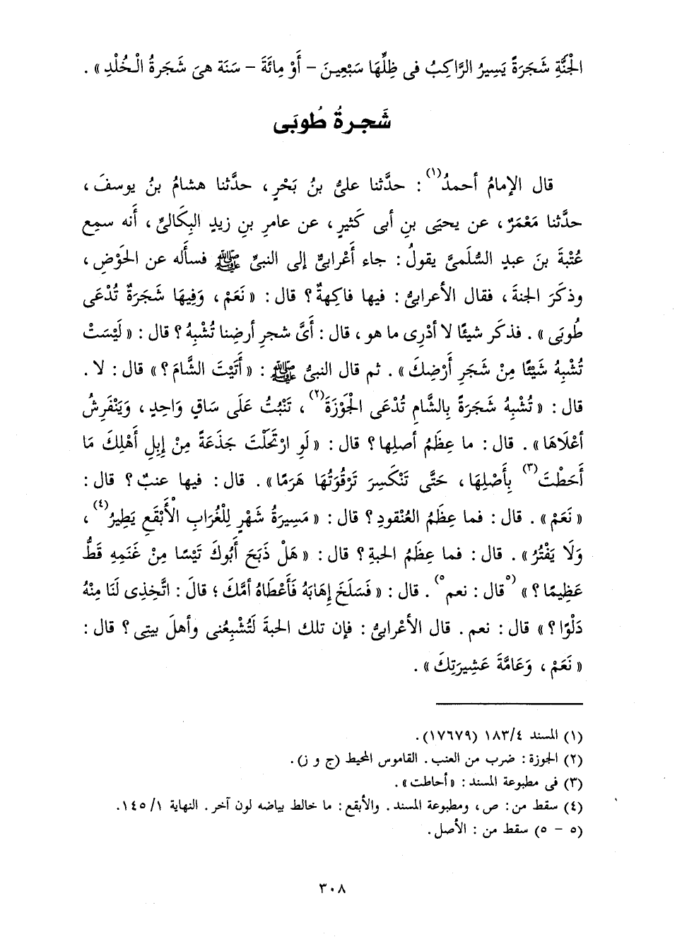 قَالَ الْإِمَامُ أَحْمَدُ: حَدَّثَنَا عَلِيُّ بْنُ بَحْرٍ، حَدَّثَنَا هِشَامُ بْنُ يُوسُفَ، حَدَّثَنَا مَعْمَرٌ، عَنْ يَحْيَى بْنِ أَبِي كَثِيرٍ، عَنْ عَامِرِ بْنِ زَيْدٍ الْبِكَالِيِّ، أَنَّهُ سَمِعَ عُتْبَةَ بْنَ عَبْدٍ السُّلَمِيَّ يَقُولُ: «جَاءَ أَعْرَابِيٌّ إِلَى النَّبِيِّ صَلَّى اللَّهُ عَلَيْهِ وَسَلَّمَ فَسَأَلَهُ عَنِ الْحَوْضِ، وَذَكَرَ الْجَنَّةَ، فَقَالَ الْأَعْرَابِيُّ: فِيهَا فَاكِهَةٌ؟ قَالَ: " نَعَمْ، وَفِيهَا شَجَرَةٌ تُدْعَى طُوبَى ". فَذَكَرَ شَيْئًا لَا أَدْرِي مَا هُوَ، قَالَ: أَيَّ شَجَرِ أَرْضِنَا تُشْبِهُ؟ قَالَ: " لَيْسَتْ تُشْبِهُ شَيْئًا مِنْ شَجَرِ أَرْضِكَ ". ثُمَّ قَالَ النَّبِيُّ صَلَّى اللَّهُ عَلَيْهِ وَسَلَّمَ: " أَتَيْتَ الشَّامَ؟ " قَالَ: لَا. قَالَ: " تُشْبِهُ شَجَرَةً بِالشَّامِ تُدْعَى الْجَوْزَةَ، تَنْبُتُ عَلَى سَاقٍ وَاحِدٍ، وَيَنْفَرِشُ أَعْلَاهَا ". قَالَ: مَا عِظَمُ أَصْلِهَا؟ قَالَ: " لَوِ ارْتَحَلْتَ جَذَعَةً مِنْ إِبِلِ أَهْلِكَ مَا أَحَطْتَ بِأَصْلِهَا، حَتَّى تَنْكَسِرَ تَرْقُوَتُهَا هَرَمًا ". قَالَ: فِيهَا عِنَبٌ؟ قَالَ: " نَعَمْ ". قَالَ: فَمَا عِظَمُ الْعُنْقُودِ؟ قَالَ: " مَسِيرَةُ شَهْرٍ لِلْغُرَابِ الْأَبْقَعِ يَطِيرُ، وَلَا يَفْتُرُ ". قَالَ: فَمَا عِظَمُ الْحَبَّةِ؟ قَالَ: " هَلْ ذَبَحَ أَبُوكَ تَيْسًا مِنْ غَنَمِهِ قَطُّ عَظِيمًا؟ " قَالَ: نَعَمْ. قَالَ: " فَسَلَخَ إِهَابَهُ فَأَعْطَاهُ أُمَّكَ، قَالَ: اتَّخِذِي لَنَا مِنْهُ دَلْوًا؟ " قَالَ: نَعَمْ. قَالَ الْأَعْرَابِيُّ: فَإِنَّ تِلْكَ الْحَبَّةَ لَتُشْبِعُنِي وَأَهْلَ بَيْتِي؟ قَالَ: " نَعَمْ، وَعَامَّةَ عَشِيرَتِكَ» ".