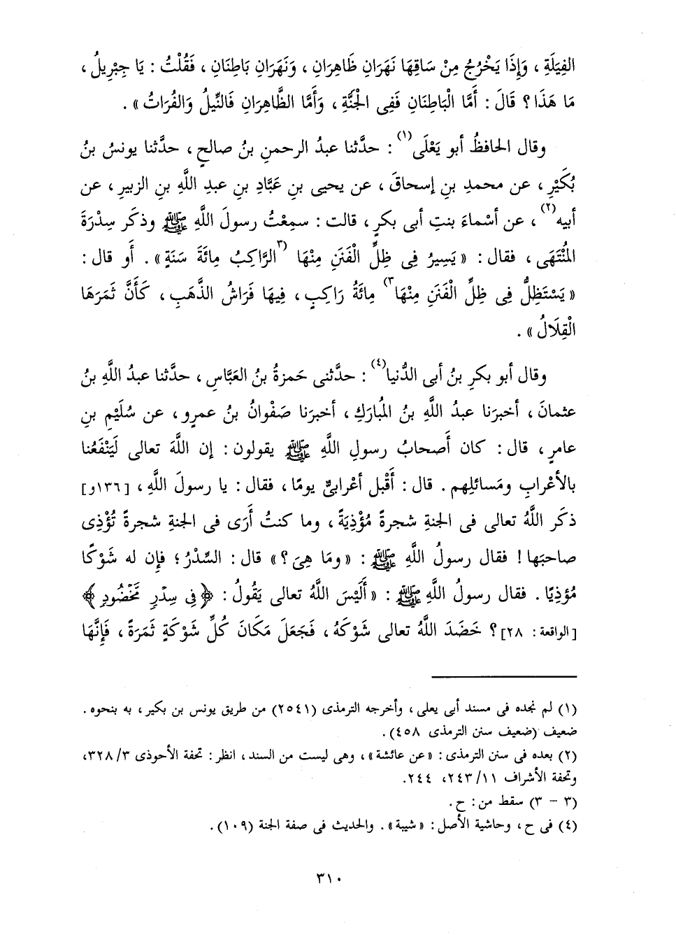 وَقَالَ أَبُو بَكْرِ بْنُ أَبِي الدُّنْيَا: حَدَّثَنِي حَمْزَةُ بْنُ الْعَبَّاسِ، حَدَّثَنَا عَبْدُ اللَّهِ بْنُ عُثْمَانَ، أَخْبَرَنَا عَبْدُ اللَّهِ بْنُ الْمُبَارَكِ، أَخْبَرَنَا صَفْوَانُ بْنُ عَمْرٍو، عَنْ سُلَيْمِ بْنِ عَامِرٍ، قَالَ: «كَانَ أَصْحَابُ رَسُولِ اللَّهِ صَلَّى اللَّهُ عَلَيْهِ وَسَلَّمَ يَقُولُونَ: إِنَّ اللَّهَ تَعَالَى لَيَنْفَعُنَا بِالْأَعْرَابِ وَمَسَائِلِهِمْ. قَالَ: أَقْبَلَ أَعْرَابِيٌّ يَوْمًا، فَقَالَ: يَا رَسُولَ اللَّهِ، ذَكَرَ اللَّهُ تَعَالَى فِي الْجَنَّةِ شَجَرَةً مُؤْذِيَةً، وَمَا كُنْتُ أَرَى فِي الْجَنَّةِ شَجَرَةً تُؤْذِي صَاحِبَهَا فَقَالَ رَسُولُ اللَّهِ صَلَّى اللَّهُ عَلَيْهِ وَسَلَّمَ: " وَمَا هِيَ؟ " قَالَ: السِّدْرُ، فَإِنَّ لَهُ شَوْكًا مُؤْذِيًا. فَقَالَ رَسُولُ اللَّهِ صَلَّى اللَّهُ عَلَيْهِ وَسَلَّمَ: " اللَّهُ تَعَالَى يَقُولُ: {فِي سِدْرٍ مَخْضُودٍ} [الواقعة: 28] خَضَدَ اللَّهُ تَعَالَى شَوْكَهُ، فَجَعَلَ مَكَانَ كُلِّ شَوْكَةٍ ثَمَرَةً، فَإِنَّهَا