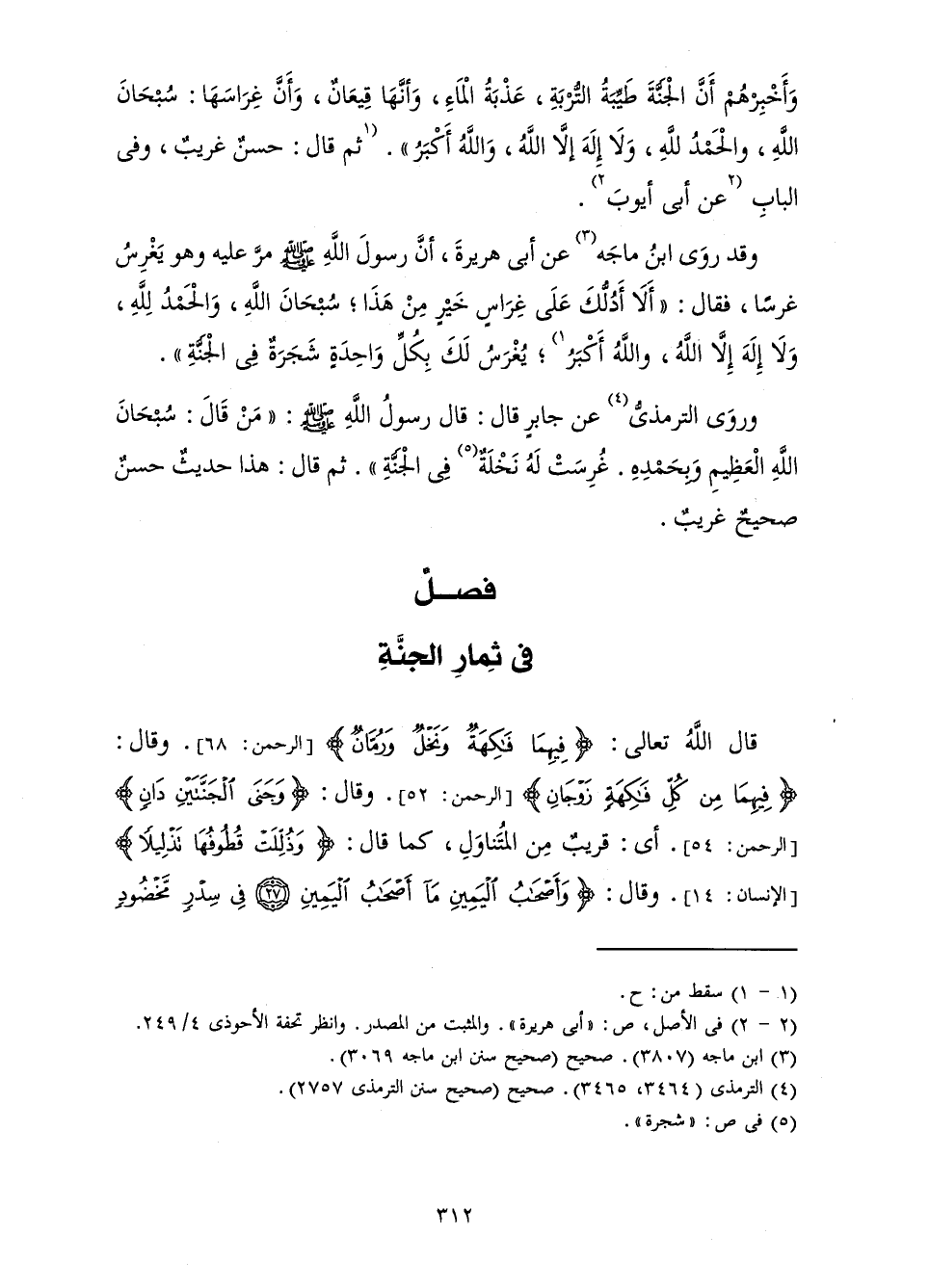 قَالَ اللَّهُ تَعَالَى: {فِيِهَا فَاكِهَةٌ وَنَخْلٌ وَرُمَّانٌ} [الرحمن: 68] . وَقَالَ: {فِيهِمَا مِنْ كُلِّ فَاكِهَةٍ زَوْجَانِ} [الرحمن: 52] . وَقَالَ: {وَجَنَى الْجَنَّتَيْنِ دَانٍ} [الرحمن: 54] . أَيْ: قَرِيبٌ مِنَ الْمُتَنَاوَلِ، كَمَا قَالَ: {وَذُلِّلَتْ قُطُوفُهَا تَذْلِيلًا} [الإنسان: 14] ، وَقَالَ: {وَأَصْحَابُ الْيَمِينِ مَا أَصْحَابُ الْيَمِينِ فِي سِدْرٍ مَخْضُودٍ وَطَلْحٍ مَنْضُودٍ وَظِلٍّ مَمْدُودٍ وَمَاءٍ مَسْكُوبٍ وَفَاكِهَةٍ كَثِيرَةٍ لَا مَقْطُوعَةٍ وَلَا مَمْنُوعَةٍ} [الواقعة: 27]