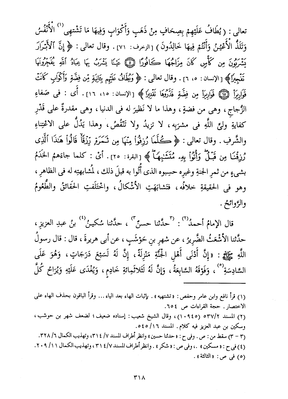 [الْإِنْسَانِ: 15، 16] . أَيْ: فِي صَفَاءِ الزُّجَاجِ، وَهِيَ مِنْ فِضَّةٍ، وَهَذَا مَا لَا نَظِيرَ لَهُ فِي الدُّنْيَا، وَهِيَ مُقَدَّرَةٌ عَلَى قَدْرِ كِفَايَةِ وَلِيِّ اللَّهِ فِي مَشْرَبِهِ لَا تَزِيدُ وَلَا تَنْقُصُ، وَهَذَا يَدُلُّ عَلَى الِاعْتِنَاءِ وَالشَّرَفِ. وَقَالَ تَعَالَى: {كُلَّمَا رُزِقُوا مِنْهَا مِنْ ثَمَرَةٍ رِزْقًا قَالُوا هَذَا الَّذِي رُزِقْنَا مِنْ قَبْلُ وَأُتُوا بِهِ مُتَشَابِهًا} [البقرة: 25] أَيْ: كُلَّمَا جَاءَهُمُ الْخَدَمُ بِشَيْءٍ مِنْ ثَمَرِ الْجَنَّةِ وَغَيْرِهِ حَسِبُوهُ الَّذِي أُتُوا بِهِ قَبْلَ ذَلِكَ، لِمُشَابَهَتِهِ لَهُ فِي الظَّاهِرِ، وَهُوَ فِي الْحَقِيقَةِ خِلَافُهُ، فَتَشَابَهَتِ الْأَشْكَالُ، وَاخْتَلَفَتِ الْحَقَائِقُ وَالطُّعُومُ وَالرَّوَائِحُ.