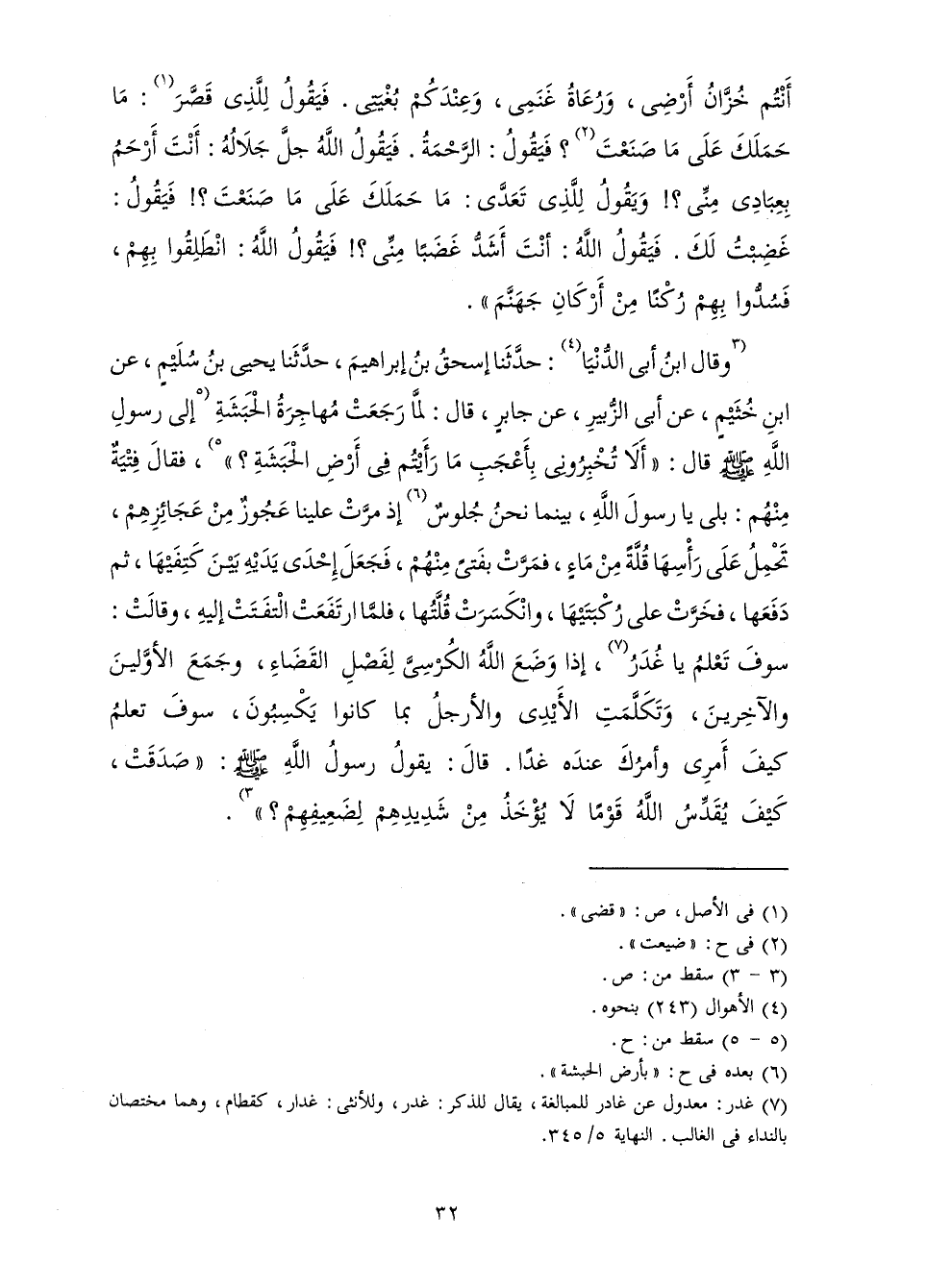 وَقَالَ ابْنُ أَبِي الدُّنْيَا: حَدَّثَنَا إِسْحَاقُ بْنُ إِبْرَاهِيمَ، حَدَّثَنَا يَحْيَى بْنُ سُلَيْمٍ، عَنِ ابْنِ خُثَيْمٍ، عَنْ أَبِي الزُّبَيْرِ، عَنْ جَابِرٍ، قَالَ: «لَمَّا رَجَعَتْ مُهَاجِرَةُ الْحَبَشَةِ إِلَى رَسُولِ اللَّهِ صَلَّى اللَّهُ عَلَيْهِ وَسَلَّمَ قَالَ: " أَلَا تُخْبِرُونِي بِأَعْجَبِ مَا رَأَيْتُمْ فِي أَرْضِ الْحَبَشَةِ؟ "، فَقَالَ فِتْيَةٌ مِنْهُمْ: بَلَى يَا رَسُولَ اللَّهِ، بَيْنَمَا نَحْنُ جُلُوسٌ إِذْ مَرَّتْ عَلَيْنَا عَجُوزٌ مِنْ عَجَائِزِهِمْ، تَحْمِلُ عَلَى رَأْسِهَا قُلَّةً مِنْ مَاءٍ، فَمَرَّتْ بِفَتًى مِنْهُمْ، فَجَعَلَ إِحْدَى يَدَيْهِ بَيْنَ كَتِفَيْهَا، ثُمَّ دَفَعَهَا، فَخَرَّتْ عَلَى رُكْبَتَيْهَا، وَانْكَسَرَتْ قُلَّتُهَا، فَلَمَّا ارْتَفَعَتِ الْتَفَتَتْ إِلَيْهِ، وَقَالَتْ: سَوْفَ تَعْلَمُ يَا غُدَرُ، إِذَا وَضَعَ اللَّهُ الْكُرْسِيَّ لِفَصْلِ الْقَضَاءِ، وَجَمَعَ الْأَوَّلِينَ وَالْآخِرِينَ، وَتَكَلَّمَتِ الْأَيْدِي وَالْأَرْجُلُ بِمَا كَانُوا يَكْسِبُونَ، سَوْفَ تَعْلَمُ كَيْفَ أَمْرِي وَأَمْرُكَ عِنْدَهُ غَدًا. قَالَ: يَقُولُ رَسُولُ اللَّهِ صَلَّى اللَّهُ عَلَيْهِ وَسَلَّمَ: " صَدَقَتْ، كَيْفَ يُقَدِّسُ اللَّهُ قَوْمًا لَا يُؤْخَذُ مِنْ شَدِيدِهِمْ لِضَعِيفِهِمْ؟» ".