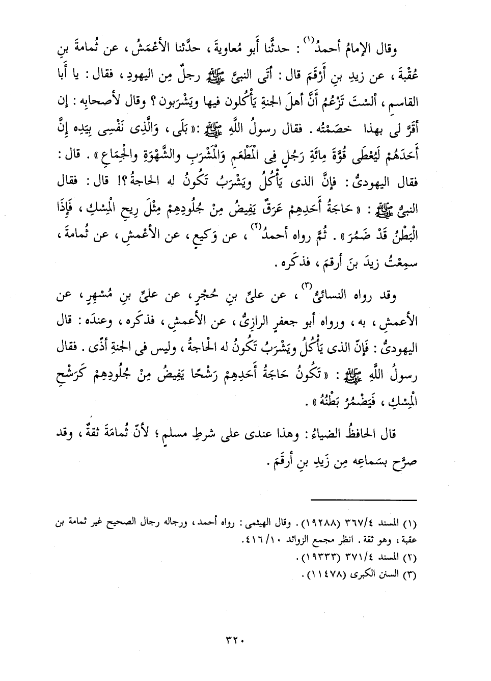 وَقَالَ الْإِمَامُ أَحْمَدُ: حَدَّثَنَا أَبُو مُعَاوِيَةَ، حَدَّثَنَا الْأَعْمَشُ، عَنْ ثُمَامَةَ بْنِ عُقْبَةَ، عَنْ زَيْدِ بْنِ أَرْقَمَ قَالَ: «أَتَى النَّبِيَّ صَلَّى اللَّهُ عَلَيْهِ وَسَلَّمَ رَجُلٌ مِنَ الْيَهُودِ، فَقَالَ: يَا أَبَا الْقَاسِمِ، أَلَسْتَ تَزْعُمُ أَنَّ أَهْلَ الْجَنَّةِ يَأْكُلُونَ فِيهَا وَيَشْرَبُونَ؟ وَقَالَ لِأَصْحَابِهِ: إِنْ أَقَرَّ لِي بِهَذَا خَصَمْتُهُ. فَقَالَ رَسُولُ اللَّهِ صَلَّى اللَّهُ عَلَيْهِ وَسَلَّمَ: " بَلَى، وَالَّذِي نَفْسِي بِيَدِهِ إِنَّ أَحَدَهُمْ لَيُعْطَى قُوَّةَ مِائَةِ رَجُلٍ فِي الْمَطْعَمِ وَالْمَشْرَبِ وَالشَّهْوَةِ وَالْجِمَاعِ ". قَالَ: فَقَالَ الْيَهُودِيُّ: فَإِنَّ الَّذِي يَأْكُلُ وَيَشْرَبُ تَكُونُ لَهُ الْحَاجَةُ؟ ! قَالَ: فَقَالَ النَّبِيُّ صَلَّى اللَّهُ عَلَيْهِ وَسَلَّمَ: " حَاجَةُ أَحَدِهِمْ عَرَقٌ يَفِيضُ مِنْ جُلُودِهِمْ مِثْلُ رِيحِ الْمِسْكِ، فَإِذَا الْبَطْنُ قَدْ ضَمُرَ» ". ثُمَّ رَوَاهُ أَحْمَدُ، عَنْ وَكِيعٍ، عَنِ الْأَعْمَشِ، عَنْ ثُمَامَةَ، سَمِعْتُ زَيْدَ بْنَ أَرْقَمَ، فَذَكَرَهُ.
