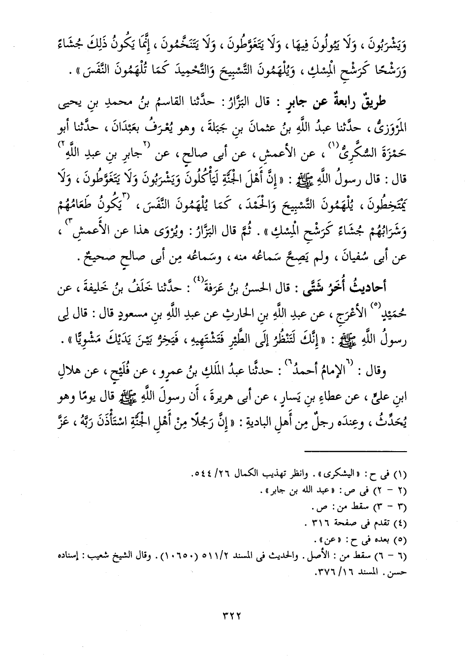 طَرِيقٌ رَابِعَةٌ عَنْ جَابِرٍ: قَالَ الْبَزَّارُ: حَدَّثَنَا الْقَاسِمُ بْنُ مُحَمَّدِ بْنِ يَحْيَى الْمَرْوَزِيُّ، حَدَّثَنَا عَبْدُ اللَّهِ بْنُ عُثْمَانَ بْنِ جَبَلَةَ، وَهُوَ يُعْرَفُ بِعَبْدَانَ، حَدَّثَنَا أَبُو حَمْزَةَ السُّكَّرِيُّ، عَنِ الْأَعْمَشِ، عَنْ أَبِي صَالِحٍ، عَنْ جَابِرِ بْنِ عَبْدِ اللَّهِ قَالَ: قَالَ رَسُولُ اللَّهِ صَلَّى اللَّهُ عَلَيْهِ وَسَلَّمَ: " «إِنَّ أَهْلَ الْجَنَّةِ لَيَأْكُلُونَ وَيَشْرَبُونَ وَلَا يَتَغَوَّطُونَ، وَلَا يَمْتَخِطُونَ، يُلْهَمُونَ التَّسْبِيحَ وَالْحَمْدَ، كَمَا يُلْهَمُونَ النَّفَسَ، يَكُونُ طَعَامُهُمْ وَشَرَابُهُمْ جُشَاءً كَرِيحِ الْمِسْكِ» ". ثُمَّ قَالَ الْبَزَّارُ: وَيُرْوَى هَذَا عَنِ الْأَعْمَشِ، عَنْ أَبِي سُفْيَانَ، وَلَمْ يَصِحَّ سَمَاعُهُ مِنْهُ، وَسَمَاعُهُ مِنْ أَبِي صَالِحٍ صَحِيحٌ.