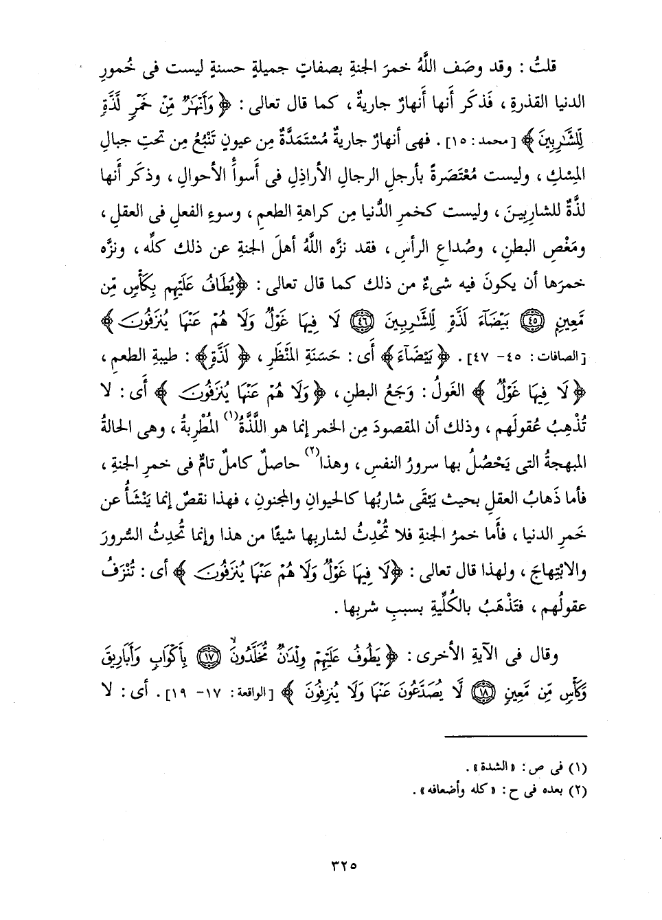 قُلْتُ: وَقَدْ وَصَفَ اللَّهُ خَمْرَ الْجَنَّةِ بِصِفَاتٍ جَمِيلَةٍ حَسَنَةٍ لَيْسَتْ فِي خُمُورِ الدُّنْيَا الْقَذِرَةِ، فَذَكَرَ أَنَّهَا أَنْهَارٌ جَارِيَةٌ، كَمَا قَالَ تَعَالَى: {وَأَنْهَارٌ مِنْ خَمْرٍ لَذَّةٍ لِلشَّارِبِينَ} [محمد: 15] . فَهِيَ أَنْهَارٌ جَارِيَةٌ مُسْتَمَدَّةٌ مِنْ عُيُونٍ تَنْبُعُ مِنْ تَحْتِ جِبَالِ الْمِسْكِ، وَلَيْسَتْ مُعْتَصَرَةً بِأَرْجُلِ الرِّجَالِ الْأَرَاذِلِ فِي أَسْوَأِ الْأَحْوَالِ، وَذَكَرَ أَنَّهَا لَذَّةٌ لِلشَّارِبِينَ، وَلَيْسَتْ كَخَمْرِ الدُّنْيَا مِنْ كَرَاهَةِ الطَّعْمِ، وَسُوءِ الْفِعْلِ فِي الْعَقْلِ، وَمَغْصِ الْبَطْنِ، وَصُدَاعِ الرَّأْسِ، فَقَدْ نَزَّهَ اللَّهُ أَهْلَ الْجَنَّةِ عَنْ ذَلِكَ كُلِّهِ، وَنَزَّهَ خَمْرَهَا أَنْ يَكُونَ فِيهِ شَيْءٌ مِنْ ذَلِكَ كَمَا قَالَ تَعَالَى: {يُطَافُ عَلَيْهِمْ بِكَأْسٍ مِنْ مَعِينٍ بَيْضَاءَ لَذَّةٍ لِلشَّارِبِينَ لَا فِيهَا غَوْلٌ وَلَا هُمْ عَنْهَا يُنْزَفُونَ} [الصافات: 45] الْغَوْلُ: وَجَعُ الْبَطْنِ، {وَلَا هُمْ عَنْهَا يُنْزَفُونَ} [الصافات: 47] أَيْ: لَا تُذْهِبُ عُقُولَهُمْ، وَذَلِكَ أَنَّ الْمَقْصُودَ مِنَ الْخَمْرِ إِنَّمَا هُوَ اللَّذَّةُ الْمُطْرِبَةُ، وَهِيَ الْحَالَةُ الْمُبْهِجَةُ الَّتِي يَحْصُلُ بِهَا سُرُورُ النَّفْسِ، وَهَذَا حَاصِلٌ كَامِلٌ تَامٌّ فِي خَمْرِ الْجَنَّةِ، فَأَمَّا ذَهَابُ الْعَقْلِ بِحَيْثُ يَبْقَى شَارِبُهَا كَالْحَيَوَانِ وَالْمَجْنُونِ، فَهَذَا نَقْصٌ إِنَّمَا يَنْشَأُ عَنْ خَمْرِ الدُّنْيَا، فَأَمَّا خَمْرُ الْجَنَّةِ فَلَا تُحْدِثُ لِشَارِبِهَا شَيْئًا مِنْ هَذَا وَإِنَّمَا تُحْدِثُ السُّرُورَ وَالِابْتِهَاجَ، وَلِهَذَا قَالَ تَعَالَى: {لَا فِيهَا غَوْلٌ وَلَا هُمْ عَنْهَا يُنْزَفُونَ} [الصافات: 47] أَيْ: تُنْزَفُ عُقُولُهُمْ، فَتَذْهَبُ بِالْكُلِّيَّةِ بِسَبَبِ شُرْبِهَا.