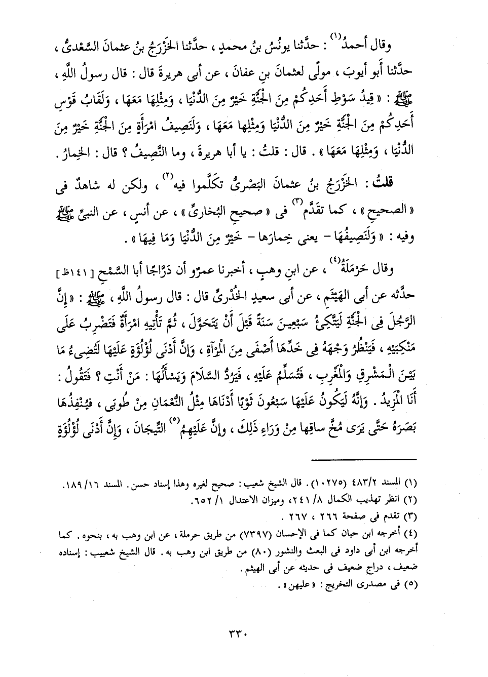 وَقَالَ حَرْمَلَةُ، عَنِ ابْنِ وَهْبٍ، أَخْبَرَنَا عَمْرٌو أَنَّ دَرَّاجًا أَبَا السَّمْحِ حَدَّثَهُ عَنْ أَبِي الْهَيْثَمِ، عَنْ أَبِي سَعِيدٍ الْخُدْرِيِّ قَالَ: قَالَ رَسُولُ اللَّهِ، صَلَّى اللَّهُ عَلَيْهِ وَسَلَّمَ: " «إِنَّ الرَّجُلَ فِي الْجَنَّةِ لَيَتَّكِئُ سَبْعِينَ سَنَةً قَبْلَ أَنْ يَتَحَوَّلَ، ثُمَّ تَأْتِيهِ امْرَأَةٌ فَتَضْرِبُ عَلَى مَنْكِبَيْهِ، فَيَنْظُرُ وَجْهَهُ فِي خَدِّهَا أَصْفَى مِنَ الْمِرْآةِ، وَإِنَّ أَدْنَى لُؤْلُؤَةٍ عَلَيْهَا لَتُضِيءُ مَا بَيْنَ الْمَشْرِقِ وَالْمَغْرِبِ، فَتُسَلِّمُ عَلَيْهِ، فَيَرُدُّ السَّلَامَ وَيَسْأَلُهَا: مَنْ أَنْتِ؟ فَتَقُولُ: أَنَا الْمَزِيدُ. وَإِنَّهُ لَيَكُونُ عَلَيْهَا سَبْعُونَ ثَوْبًا أَدْنَاهَا مِثْلُ النُّعْمَانِ مِنْ طُوبَى، فَيُنْفِذُهَا بَصَرَهُ حَتَّى يَرَى مُخَّ سَاقِهَا مِنْ وَرَاءِ ذَلِكَ، وَإِنَّ عَلَيْهِمُ التِّيجَانَ، وَإِنَّ أَدْنَى لُؤْلُؤَةٍ