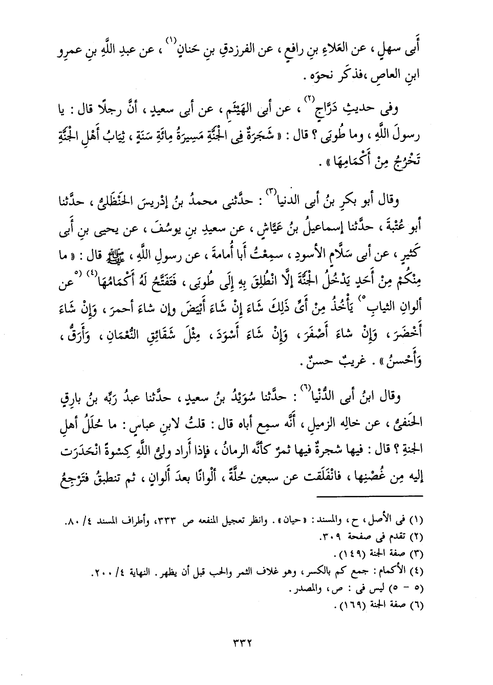 وَفِي حَدِيثِ دَرَّاجٍ، عَنْ أَبِي الْهَيْثَمِ، عَنْ أَبِي سَعِيدٍ، «أَنَّ رَجُلًا قَالَ: يَا رَسُولَ اللَّهِ، وَمَا طُوبَى؟ قَالَ: " شَجَرَةٌ فِي الْجَنَّةِ مَسِيرَةُ مِائَةِ سَنَةٍ، ثِيَابُ أَهْلِ الْجَنَّةِ تَخْرُجُ مِنْ أَكْمَامِهَا» ".