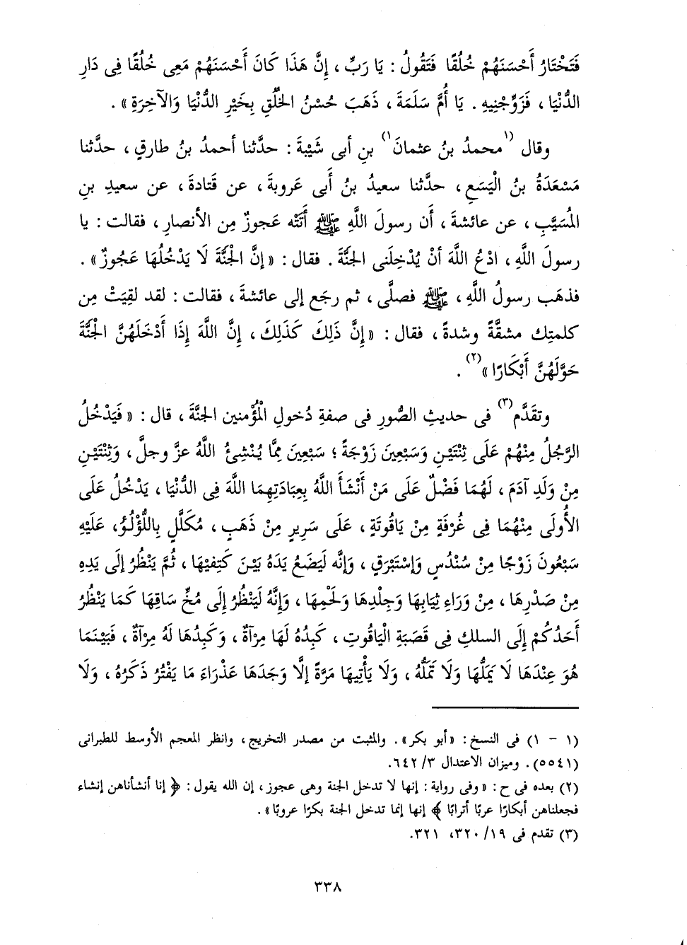 وَقَالَ مُحَمَّدُ بْنُ عُثْمَانَ بْنِ أَبِي شَيْبَةَ: حَدَّثَنَا أَحْمَدُ بْنُ طَارِقٍ، حَدَّثَنَا مَسْعَدَةُ بْنُ الْيَسَعِ، حَدَّثَنَا سَعِيدُ بْنُ أَبِي عَرُوبَةَ، عَنْ قَتَادَةَ، عَنْ سَعِيدِ بْنِ الْمُسَيَّبِ، عَنْ عَائِشَةَ، «أَنَّ رَسُولَ اللَّهِ صَلَّى اللَّهُ عَلَيْهِ وَسَلَّمَ أَتَتْهُ عَجُوزٌ مِنَ الْأَنْصَارِ، فَقَالَتْ: يَا رَسُولَ اللَّهِ، ادْعُ اللَّهَ أَنْ يُدْخِلَنِي الْجَنَّةَ. فَقَالَ: " إِنَّ الْجَنَّةَ لَا يَدْخُلُهَا عَجُوزٌ " فَذَهَبَ رَسُولُ اللَّهِ، صَلَّى اللَّهُ عَلَيْهِ وَسَلَّمَ فَصَلَّى، ثُمَّ رَجَعَ إِلَى عَائِشَةَ، فَقَالَتْ: لَقَدْ لَقِيَتْ مِنْ كَلِمَتِكَ مَشَقَّةً وَشِدَّةً، فَقَالَ: " إِنَّ ذَلِكَ كَذَلِكَ، إِنَّ اللَّهَ إِذَا أَدْخَلَهُنَّ الْجَنَّةَ حَوَّلَهُنَّ أَبْكَارًا» ".